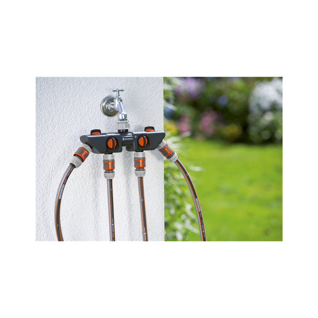 Štyricestný pripojovací bod od spoločnosti GARDENA slúži na súčasné pripojenie niekoľkých zariadení k jednému kohútiku. Prietok vody je možné pre každý výstup samostatne regulovať alebo vypnúť. K 4-cestnému rozdeľovaču možno pripojiť dva vodné počítače alebo časovače od spoločnosti GARDENA. Pomocou závitovej prípojky na vodovodný kohútik, ktorá je súčasťou systému Profi Maxi-Flow (č. v. 2801-20), možno štvorcestný rozdeľovač prispôsobiť systému Profi Maxi-Flow od spoločnosti GARDENA. Je vhodný pre vodovodné kohútiky so závitom 33,3 mm (G 1") a vodovodné kohútiky so závitom 26,5 mm (G 3/4").