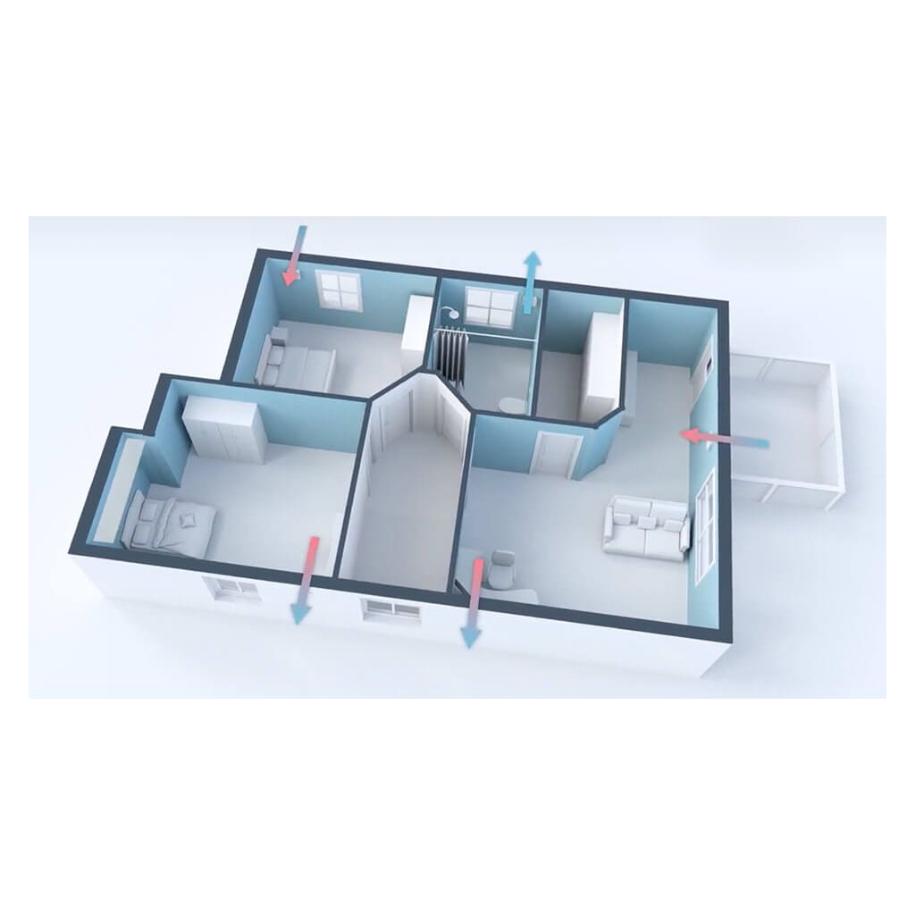 Privetrávanie alebo odvetrávanie s vysokým prietokom vzduchu aj nad rámec jednej miestnosti.