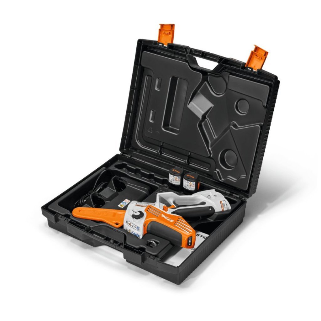 S výhodnou sadou STIHL GTA 40, ktorá obsahuje 2 akumulátory AS 2 a rýchlonabíjačku AL 5-2, sa môžete okamžite pustiť do práce. Súčasťou je praktický kufor s priestorom až pre 6 akumulátorov AS 2 a samotná aku píla STIHL GTA 40 na jednoduchú prepravu a skladovanie.