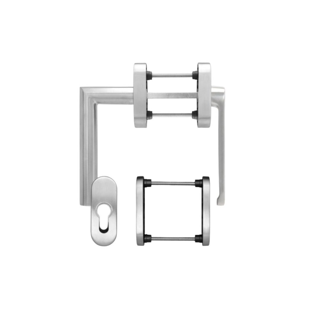 Elegantné nerezové kovanie na balkónové dvere, ktoré dizajnovo ladí s blaugelb okennou kľučkou FGS 90°-Form. Vďaka svojej nízkej (plochej) konštrukcii je ideálne pre vonkajšie dvere so žalúziami, roletami, slnolamami či siete proti hmyzu — nezaberá miesto a nikde neprekáža.