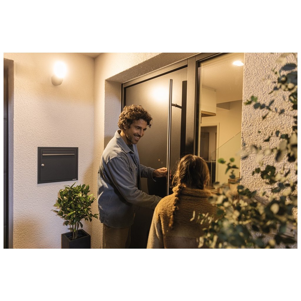 - Pripravená na okamžité použitie vďaka integrovanej pamäťovej karte microSD a mimoriadne jednoduchému uvedeniu do prevádzky (pomocou asistenta aplikácie v priebehu niekoľkých minút); Možno umiestniť na miesto existujúceho vonkajšieho osvetlenia s pripojením na 230 V