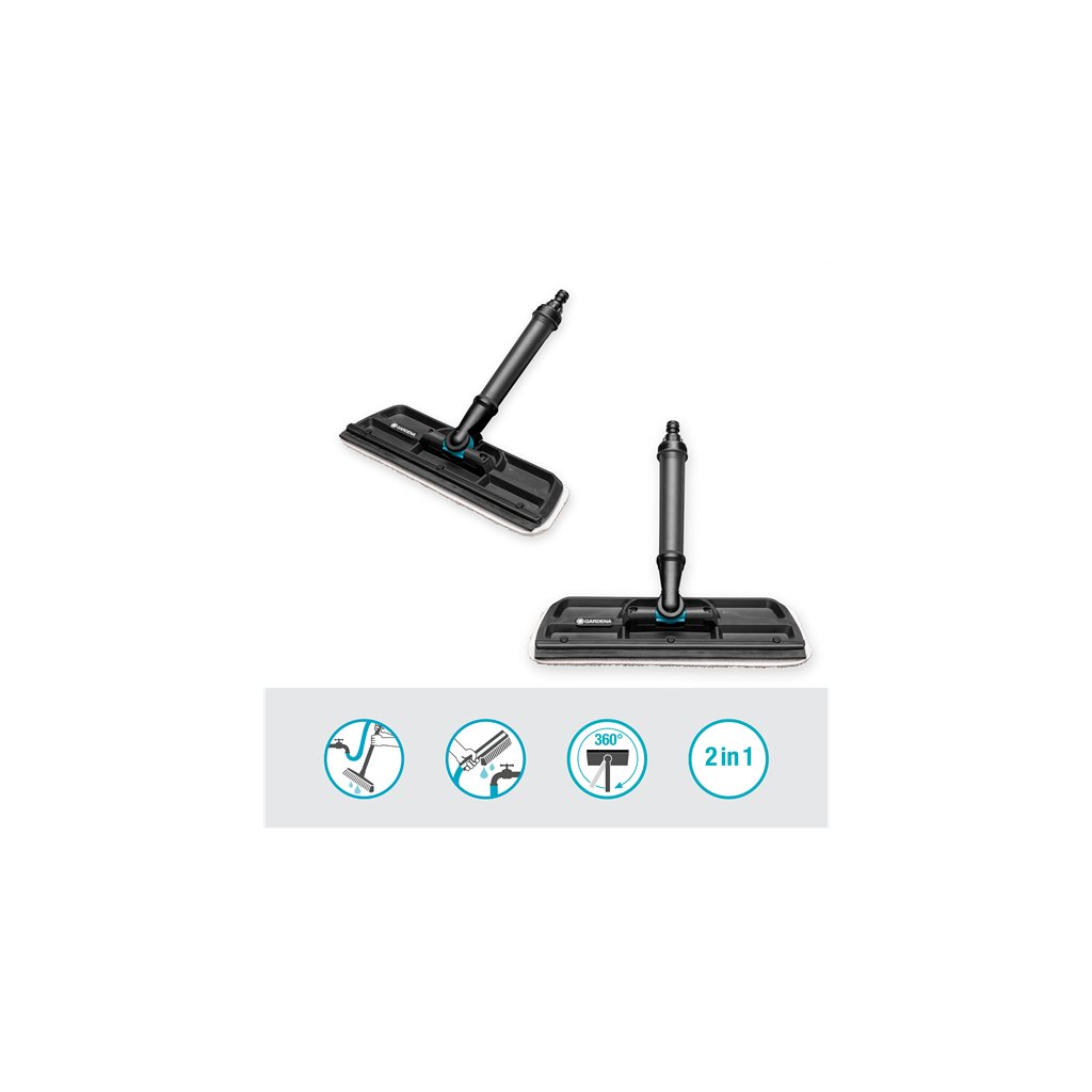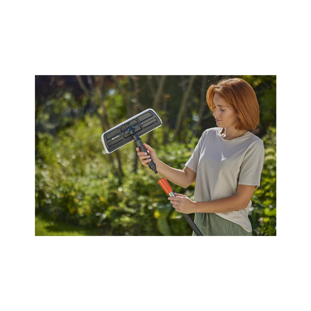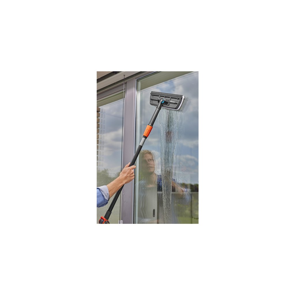 - Čistenie vonkajších sklenených povrchov. Vďaka pripojeniu Original Gardena System možno čistič okien pripojiť priamo k záhradnej hadici ako ručný nástroj a používať ho na čistenie menších okenných plôch alebo na čistenie väčších plôch v kombinácii s násadou Cleansystem.