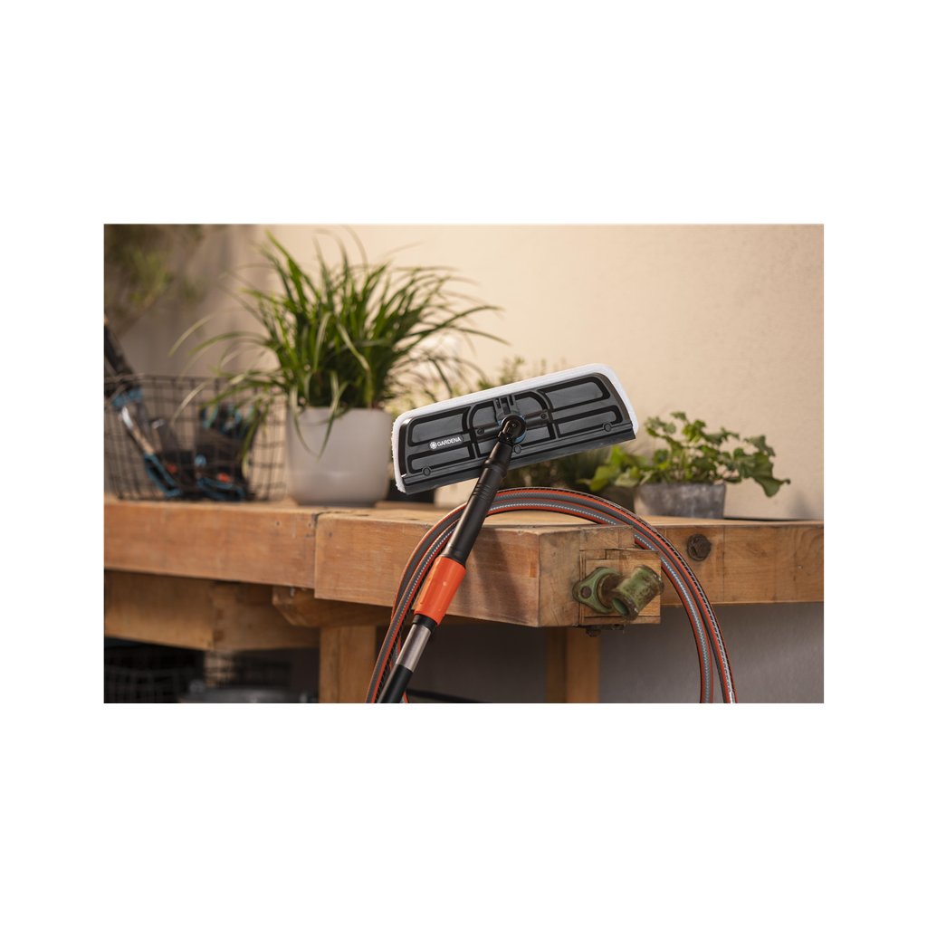 - Optimálna dostupnosť s násadou Gardena Cleansystem: Použitie prietokovej násady Gardena poskytuje ideálne predĺženie na dosiahnutie vyšších miest a čistenie väčších plôch. Vyššie okná, strechy terás, celé skleníky alebo zimné záhrady možno čistiť bez námahy. V kombinácii so šampónom Gardena sa účinnosť rukoväte s kefou ešte zvýši. Množstvo dodávanej vody možno nastaviť na rukoväti.