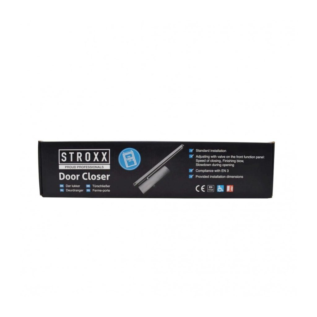 Dverový zatvárač STROXX F6303BCG v atraktívnom matnom čiernom vyhotovení je určený na pohodlné a tiché zatváranie jednokrídlových dverí so šírkou do 1050 mm a hmotnosťou 60 kg. Vďaka certifikácii EN1154 a kvalitnej hliníkovej konštrukcii je ideálnou voľbou pre obytné a komerčné prostredie.