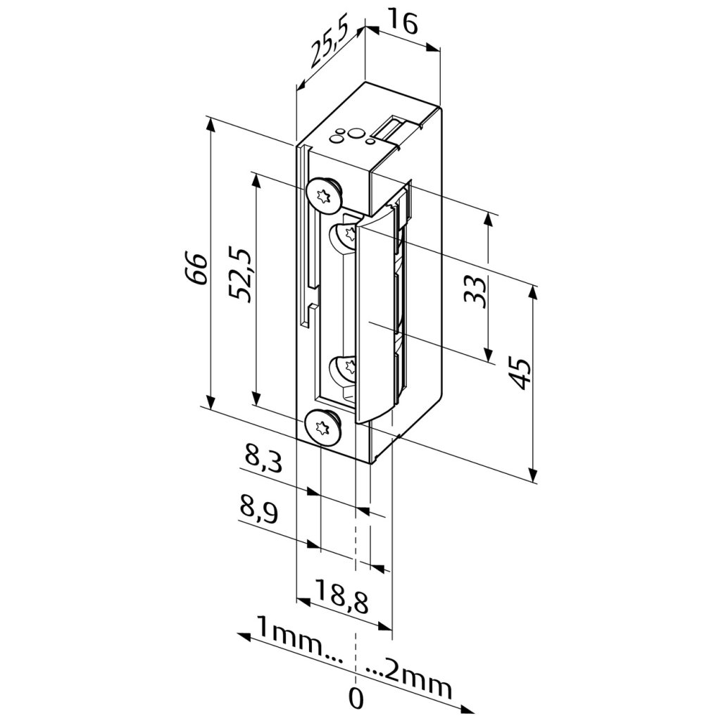 Elektrický otvárač effeff 118F-A71 odolný voči ohňu, 10-24 V AC/DC nízkeho napätia v tenkom prevedení s hrúbkou tela iba 16 mm. Bez krycej dosky. Na inštaláciu na pravé aj ľavé dvere. Tento zámok je v polohe "odomknuté" len počas trvania napäťového impulzu. Mimo tohto času je závora zámku v polohe "zablokovaná".