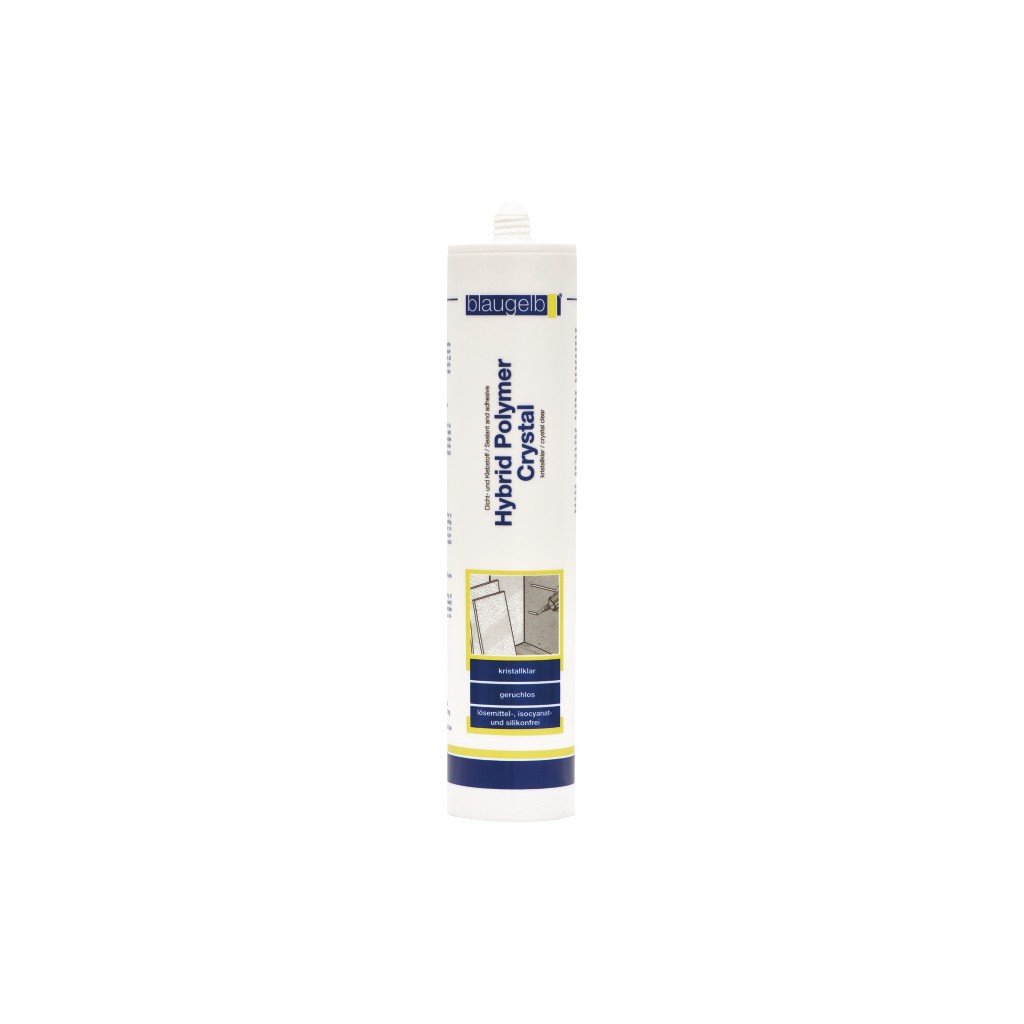 Vďaka svojej vysokej transparentnosti je hybridný polymér Crystal blaugelb ideálny na lepenie skla alebo skiel s vysokým stupňom transparentnosti. Je ideálny na sklo v interiéri, ale aj na rôzne iné aplikácie (nie je to tmel na sklo). Hybrid Polymer Crystal blaugelb je odolný voči vode a poveternostným vplyvom, ako aj mnohým chemikáliám.