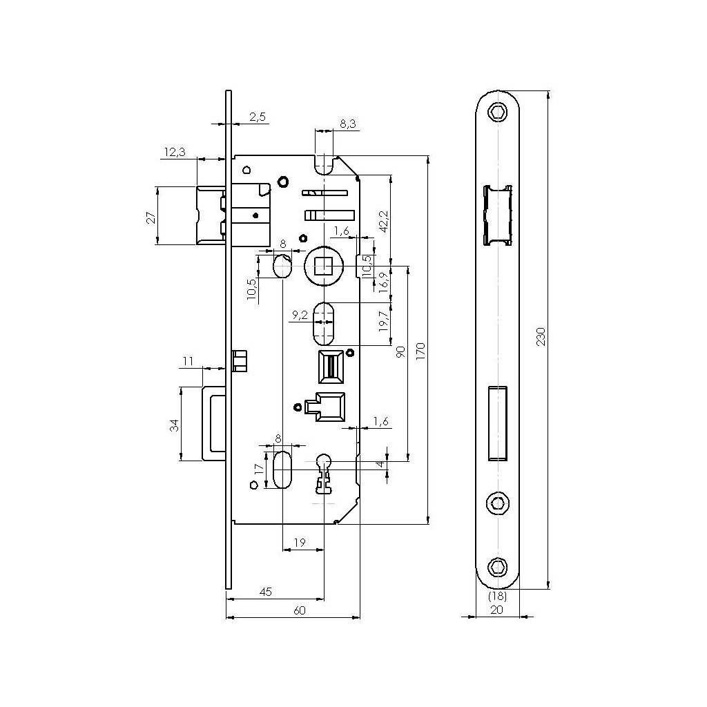 Jednobodový kľúčový zámok, 20 mm čelo, 90/45/60 mm, ZnCr