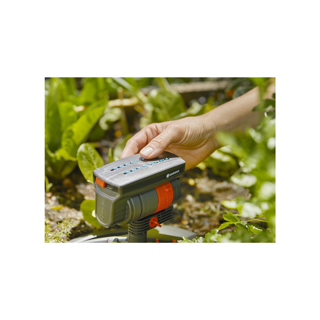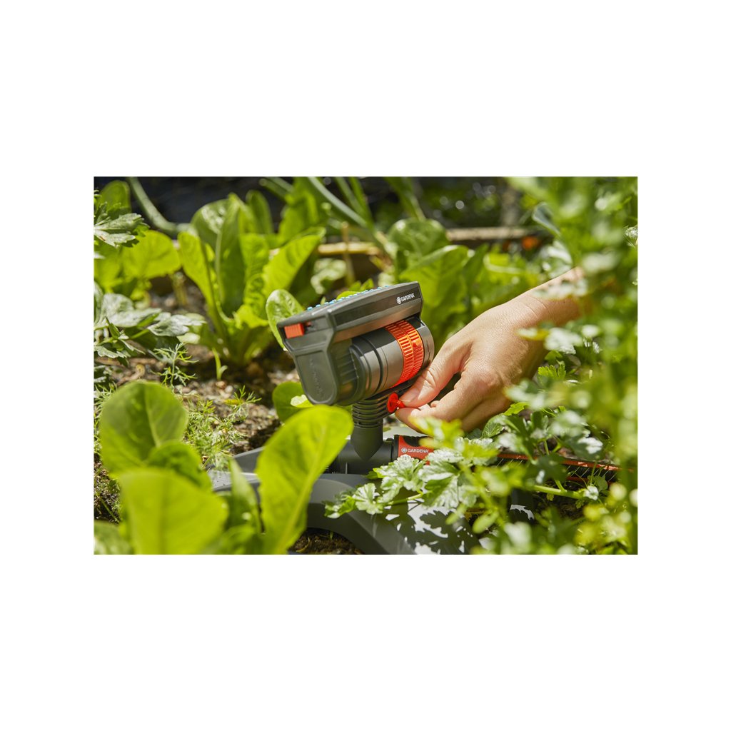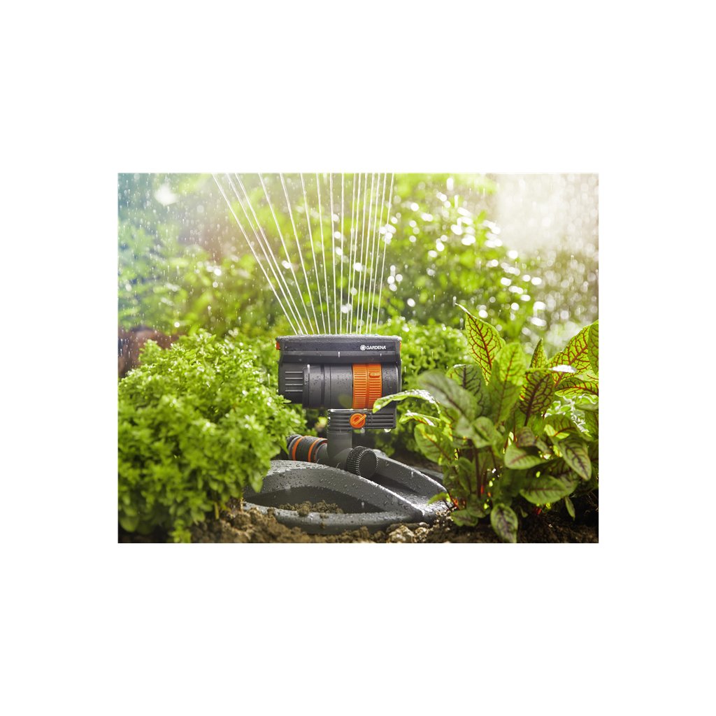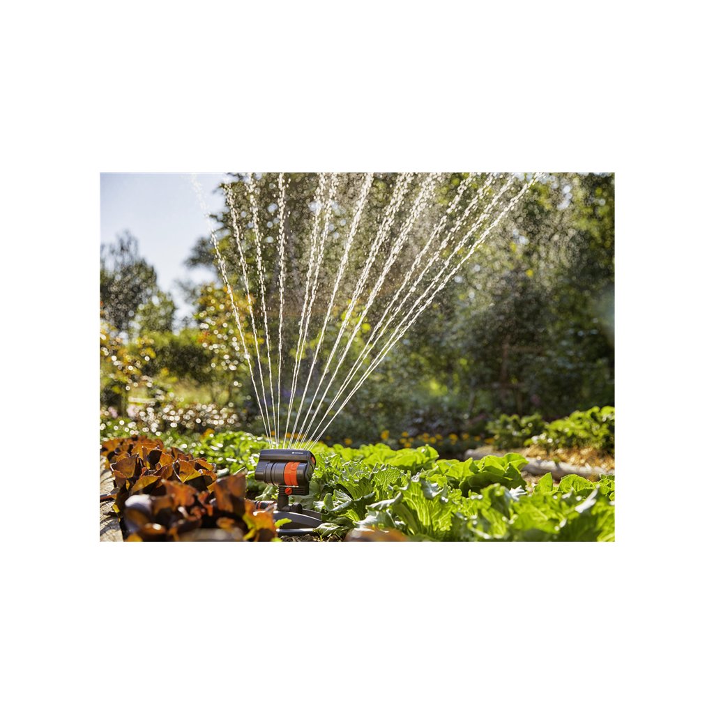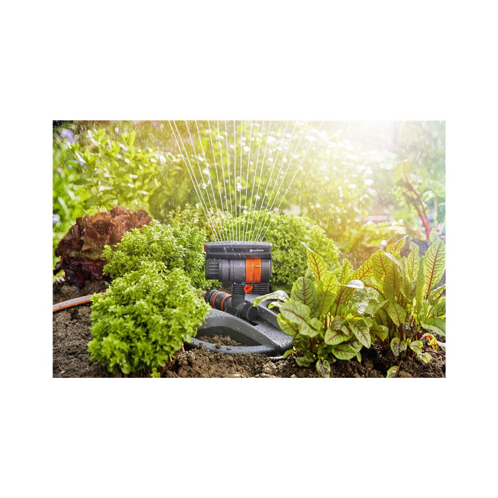 Zavlažovač je vybavený okrúhlou základňou, vďaka ktorej stabilne stojí na zemi. Preto je veľmi pohodlné umiestniť zavlažovač do stredu zeleninového záhonu a polievať rastliny okolo neho. Kompaktný zavlažovač AquaZoom pokrýva veľkorysú plochu od 9 do 216 m². Posuvník nastavenia umožňuje flexibilne určiť dosah (3-18 metrov) a šírku postreku (3-12 metrov). Vďaka použitiu vysokokvalitných materiálov pri výrobe sa môžete tešiť na 5-ročnú záruku a pečať Made in Germany, ako aj na to, že váš zavlažovač od spoločnosti GARDENA nepoškodí ani mráz, ani UV žiarenie.