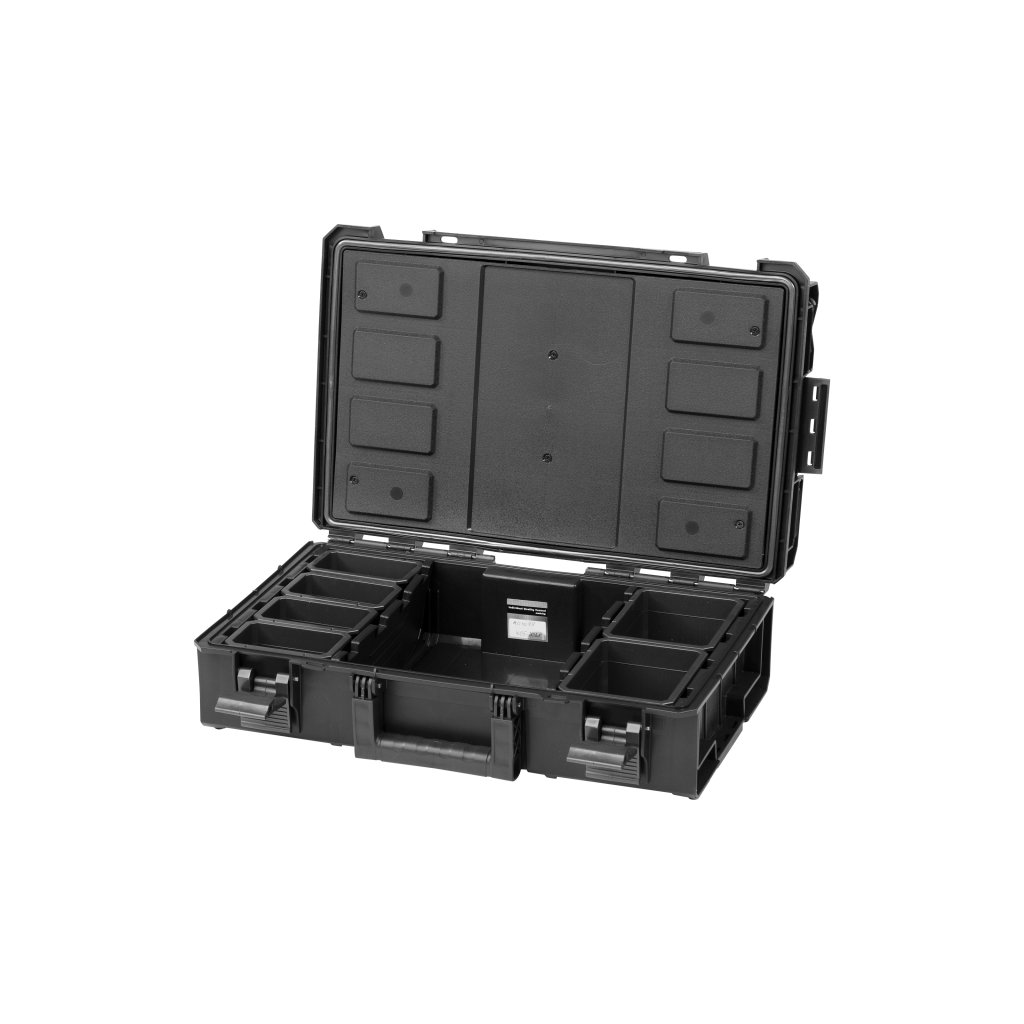Vďaka šiestim modulárne nastaviteľným priečinkom si môžete vnútorný priestor prispôsobiť podľa svojich potrieb - ideálne na oddelenie rôznych typov náradia, skrutiek, hmoždiniek alebo iných montážnych prvkov. Deliace priečky sa dajú jednoducho premiestniť alebo odstrániť, čo vám umožní rýchlo zmeniť usporiadanie obsahu kufra podľa aktuálnej práce.