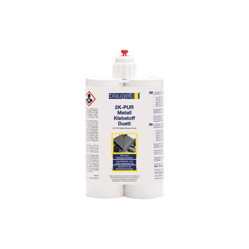 Blaugelb 2K PUR Duett lepidlo na kov sa používa na lepenie hliníkových a kovových rohov a profilov pri výrobe okien, vozidiel a kontajnerov. Lepidlo na kov blaugelb 2K PUR Duett je veľmi vhodné aj na výrobu kompozitných prvkov s tvrdým drevom, PS, PUR alebo PVC penou.