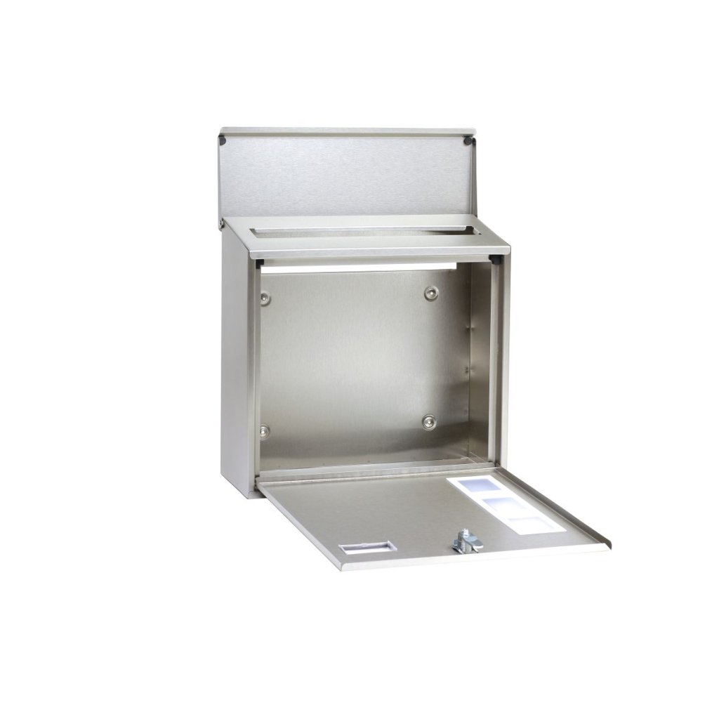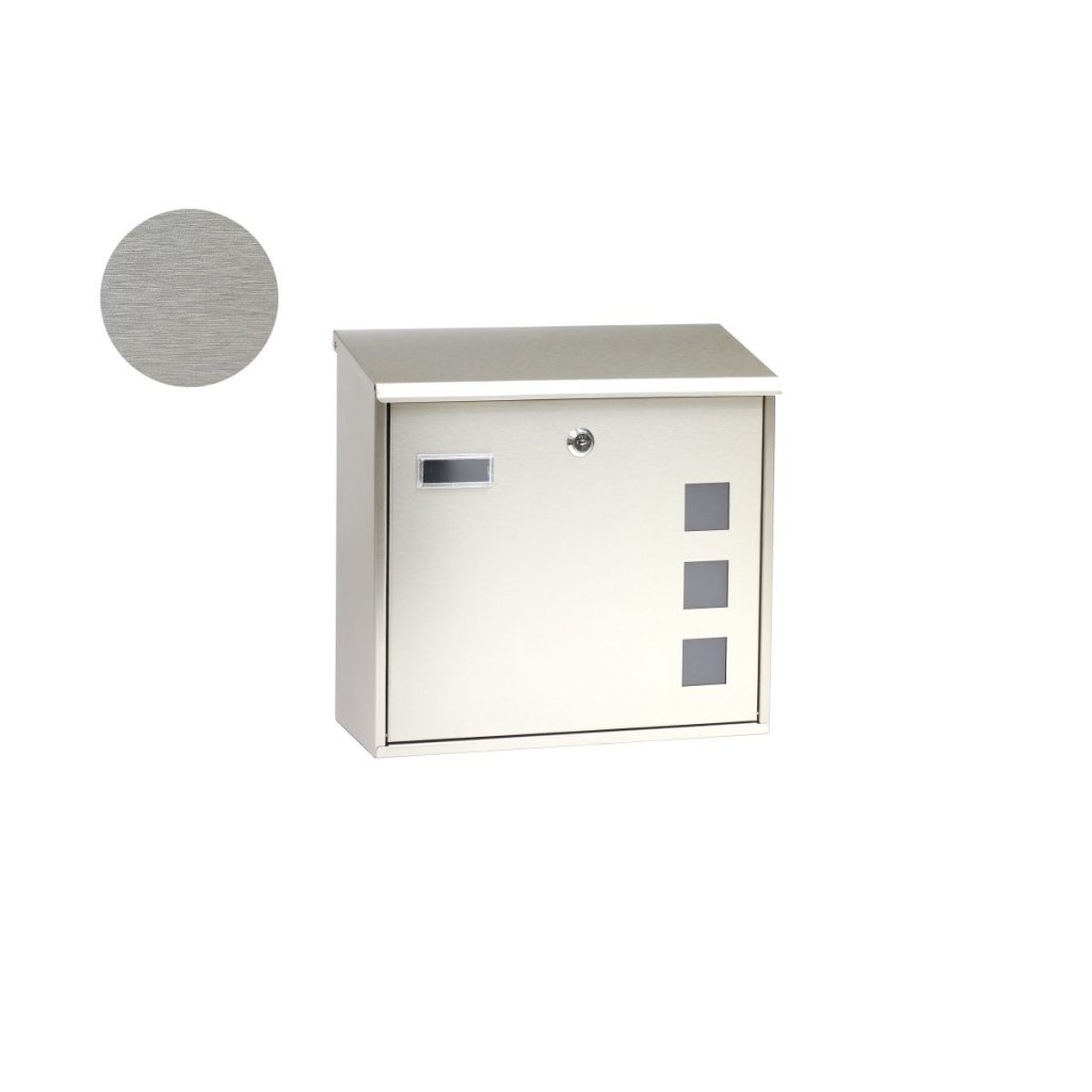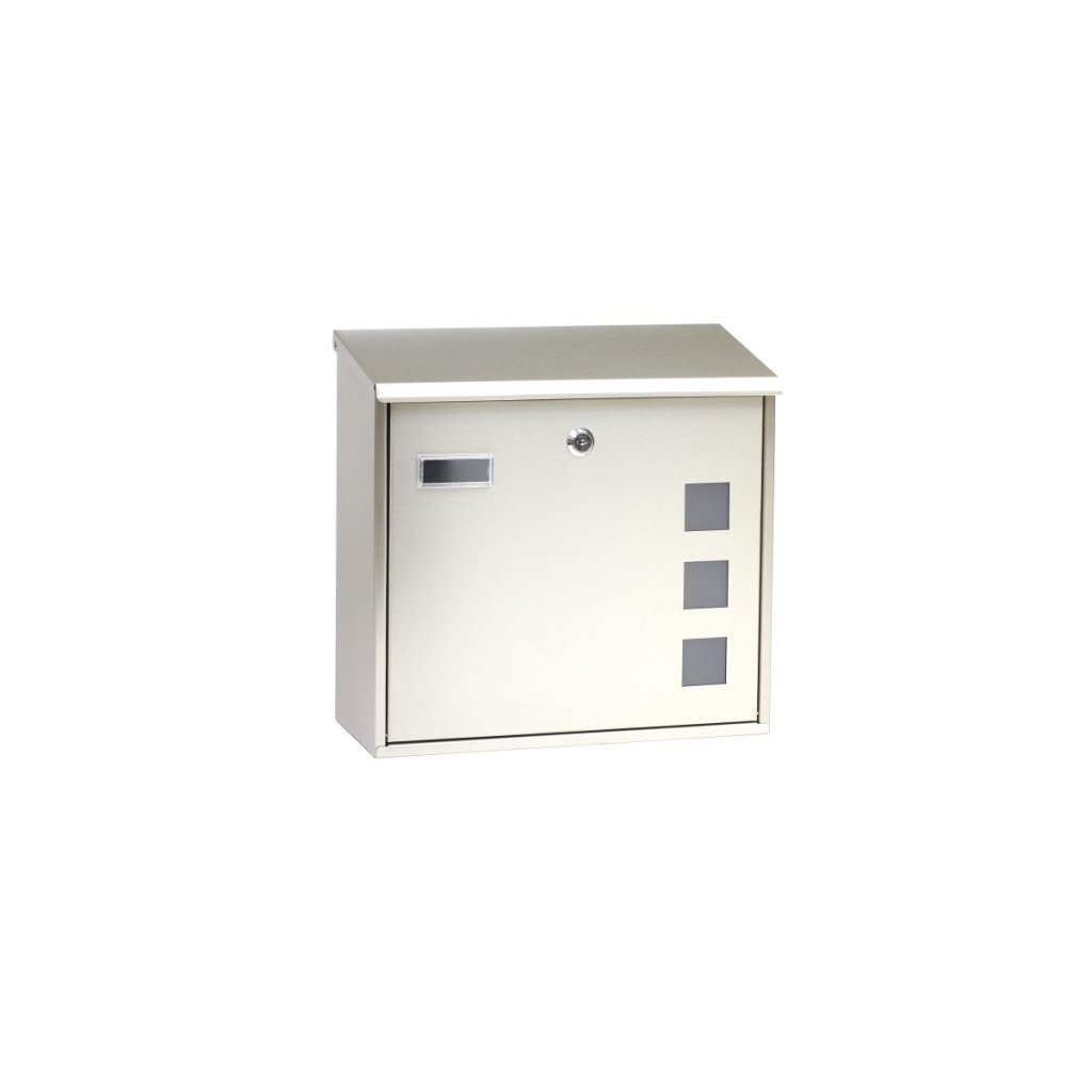 Poštová schránka z nehrdzavejúcej ocele s matnými plexisklovými oknami, ktoré umožňujú čiastočný pohľad do jej vnútra, a zadným vhadzovaním