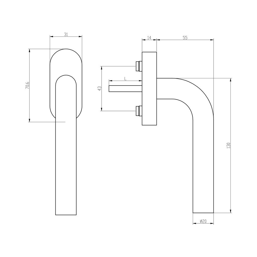 Okenná kľučka BLAUGELB FGS, tvar L, 7/43, M5x50, nerezová oceľ