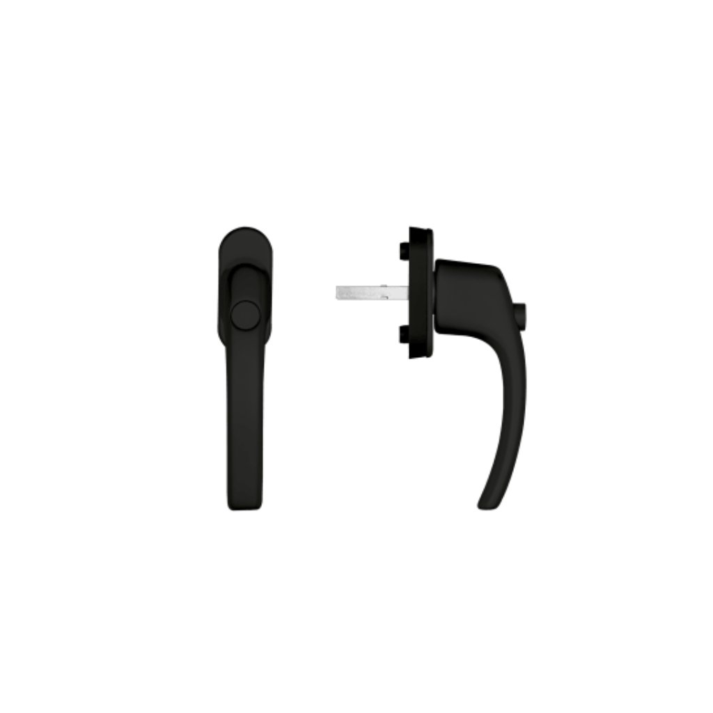 Okenná kľučka BLAUGELB FGS 1758 s tlačidlom, 45°, štvorhran 43 mm, vrátane skrutiek, RAL9005M matná čierna