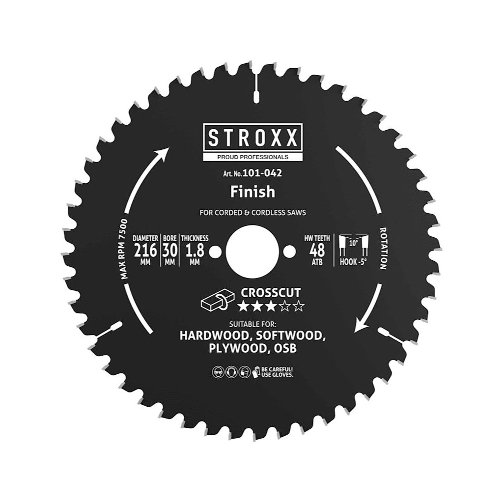 STROXX NEG kotúč na drevo Ø 216 mm, 48 zubov, WZ. STROXX NEG pílový kotúč s priemerom 216 mm, šírkou rezu 1,8 mm a otvorom 30 mm, s 48 tvrdokovovými zubami (WZ), je výbornou voľbou pre presné a efektívne rezanie dreva. Optimalizované uhly zubu zabezpečujú hladký rez pri zvýšenej výmene materiálu.