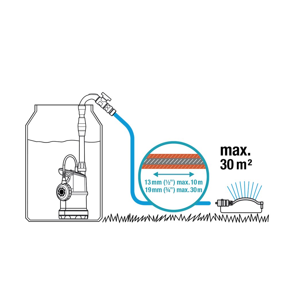 Čerpadlo do suda 4700/2 inox na čerpanie dažďovej vody zo sudov alebo nádrží na použitie na zavlažovanie záhrady. Praktické ponorné čerpadlo je veľmi účinné a ľahko sa používa. Má úzke telo s priemerom len 149 mm. Čerpadlo je vyrobené z vysokokvalitnej nehrdzavejúcej ocele s vynikajúcim prepravným výkonom 4700 l/h. Čerpadlo obsahuje filter, ktorý zabraňuje vniknutiu nečistôt a iných častíc do čerpadla, aby sa zabránilo poškodeniu v dôsledku upchatých dýz.