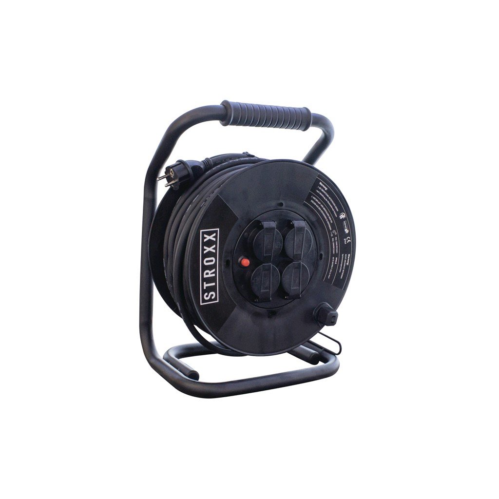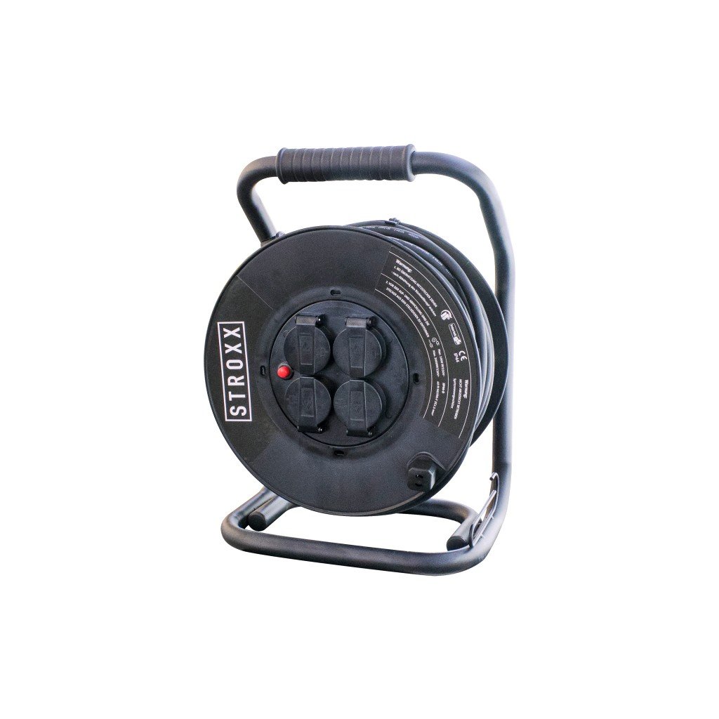 S káblovým navijakom STROXX vám nikdy nedôjde energia, 40 metrov dlhý kábel dodáva energiu aj do tých najodľahlejších kútov, neoprénový kábel H 07 RN - F 3G 1,5 mm2 je vhodný na vysoké mechanické zaťaženie a dlhodobé používanie vo vonkajšom prostredí. Trieda ochrany IP 44 poskytuje ochranu proti cudzím telesám a striekajúcej vode. Vyhovuje európskym a národným normám smernice podľa CE a GS, 40 m dlhý neoprénový kábel na plastovom telese, ergonomicky tvarovaná rukoväť pod uhlom 45°, s držiakom kábla a aretačnou skrutkou, ochrana proti prehriatiu pre bezpečnú prácu, typ kábla H 07 RN - F 3G, prierez vodičov : 1,5 mm2, farba kábla : čierna, krytie : IP 44, 4 zásuvky s krytkami, napätie : 230 V, výkon : 3000 W. 1000 wattov valcovaný výkon.