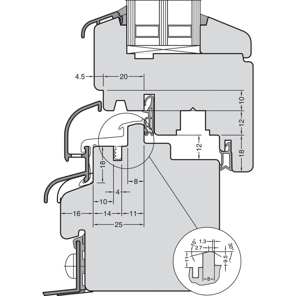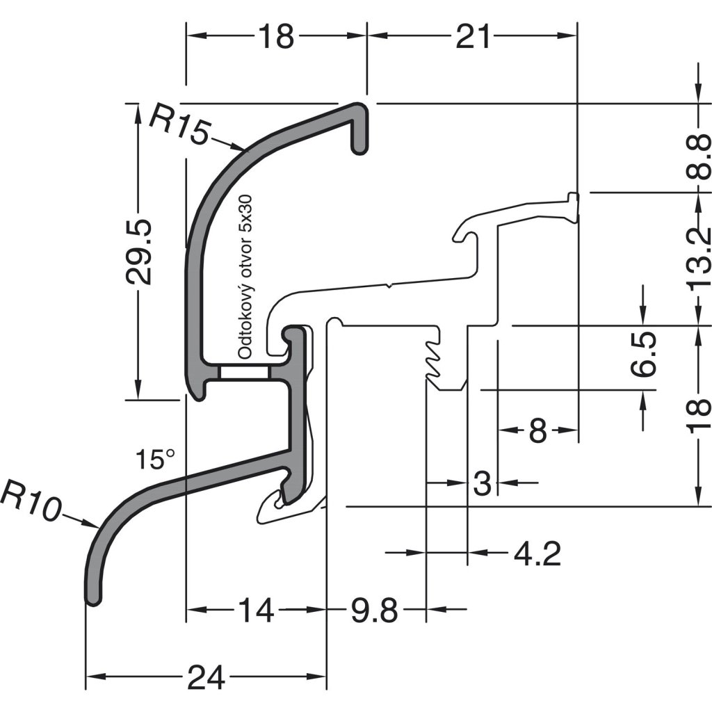 Špeciálny vysokoobjemový profil s presahom rámu. Použitie pre 25 mm falc. Znížená plocha kontaktu s tesnením a väčší priestor pre kondenzáciu. Okap naformátujeme podľa vašich požiadaviek. Stačí zadať požadované rozmery do poznámky na konci objednávky.