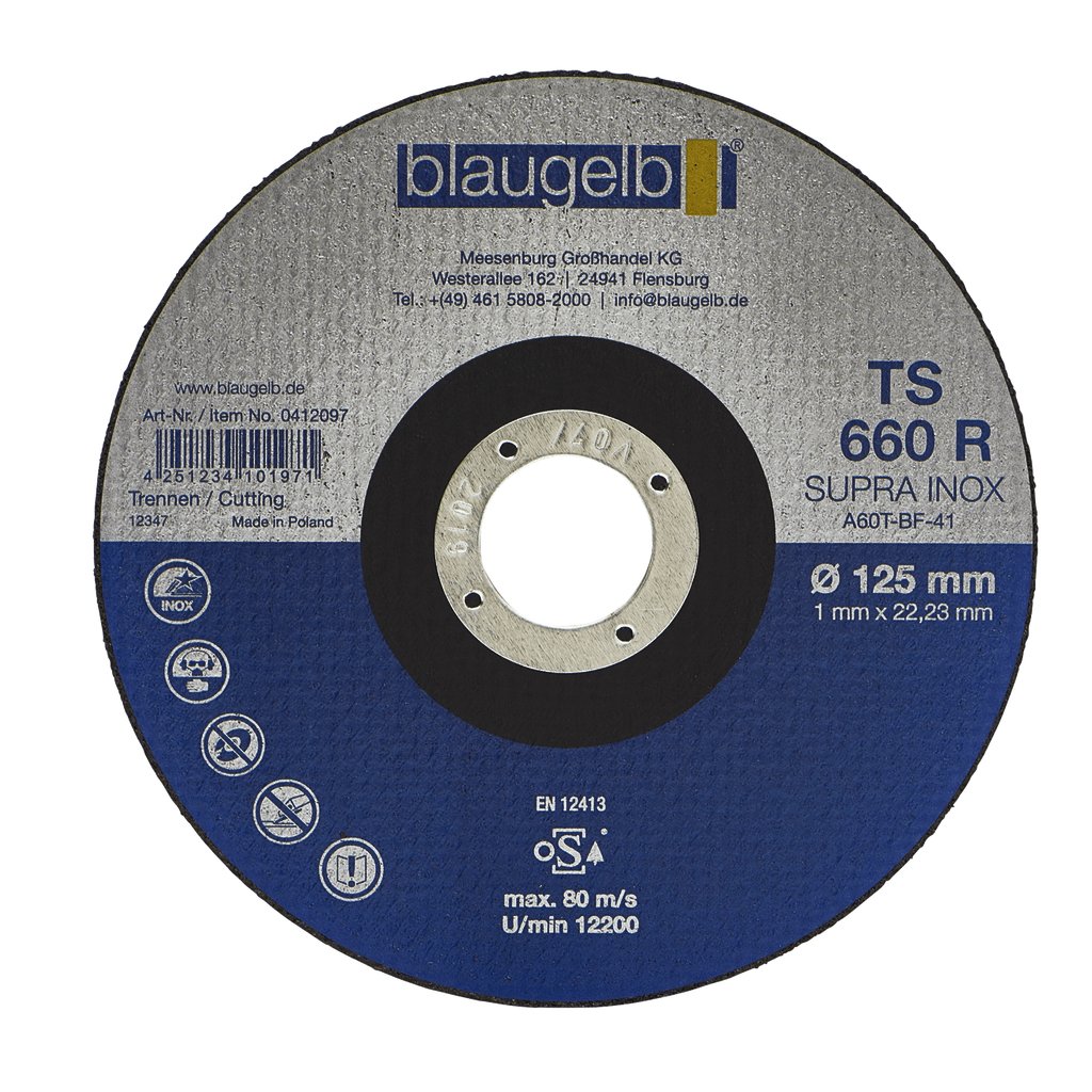 Rezný kotúč blaugelb A 660 R SUPRA INOX je vďaka svojej malej hrúbke čepele ideálny na rýchle rezanie obrobkov bez otrepov. Vysoko výkonný rezný kotúč s nízkym vývinom tepla. Je vhodný na rezanie plechov, rúr a profilov z ocele a nehrdzavejúcej ocele. Neobsahuje chlór, železo a síru. Rezné kotúče blaugelb A 660 R SUPRA INOX s hrúbkou kotúča 1 mm sú tenké rezné kotúče s najkratším časom rezania a minimálnou tvorbou otrepov a sú vhodné pre uhlové brúsky všetkých výkonnostných tried.