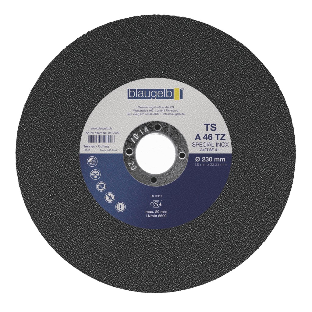 Rozrezávací kotúč blaugelb A 46 TZ Special INOX je určený na vysoko výkonné použitie a presvedčí veľmi dlhou životnosťou. Vďaka nízkej úrovni tvorby otrepov je nepostrádateľným spoločníkom pri rezaní menších prierezov nehrdzavejúcej ocele (plechov, rúr a profilov). Rezný kotúč blaugelb A 46 TZ Special INOX s hrúbkou čepele 1,9 mm kombinuje veľmi dobrý rezný výkon s vysokou bočnou stabilitou.