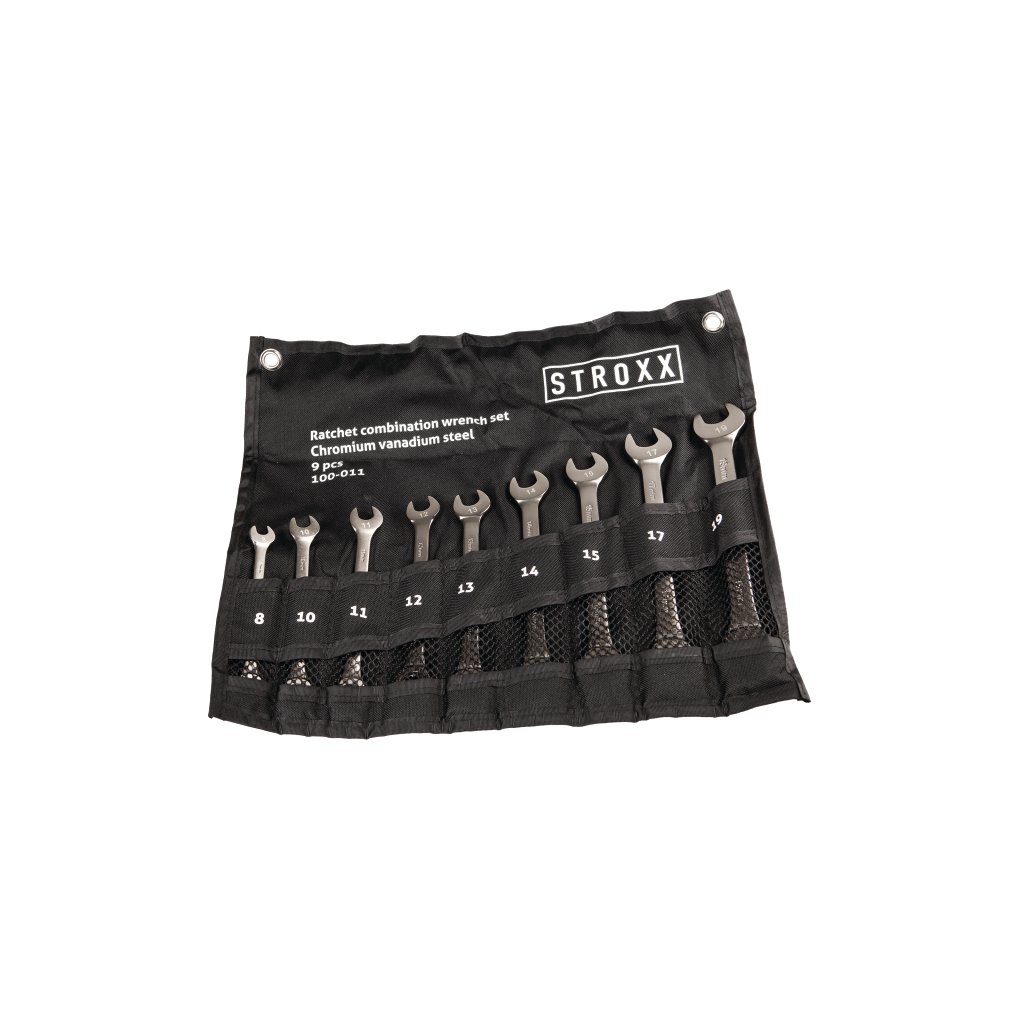 Sada kľúčov STROXX obsahuje veľkosti od 8 do 19 milimetrov. Matný chrómový povlak chráni náradie pred koróziou. Súprava sa dodáva v čiernej taške. Vďaka dvom očkám na hornom okraji tašky sa dá taška ľahko zavesiť.