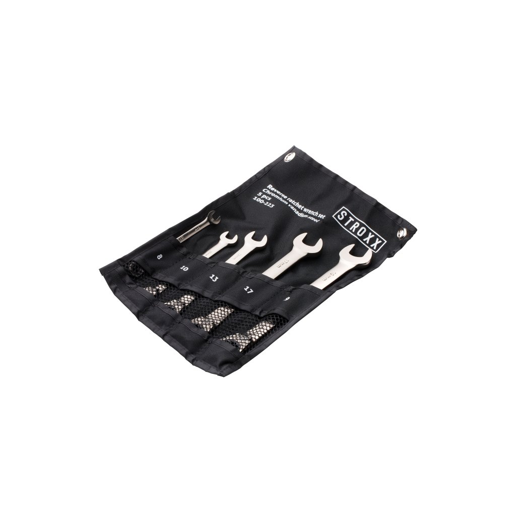Súprava STROXX s otočným mechanizmom sa skladá z 5 dielov. Západky sú určené na použitie ako otvorené aj krúžkové západky. Obojstranný mechanizmus umožňuje jednoduché prepínanie smeru otáčania. Súprava je vhodná na rôzne mechanické aplikácie a ponúka všestrannosť a pohodlie pri práci. Každý diel je starostlivo vyrobený tak, aby sa zabezpečila jeho trvanlivosť a spoľahlivosť.
