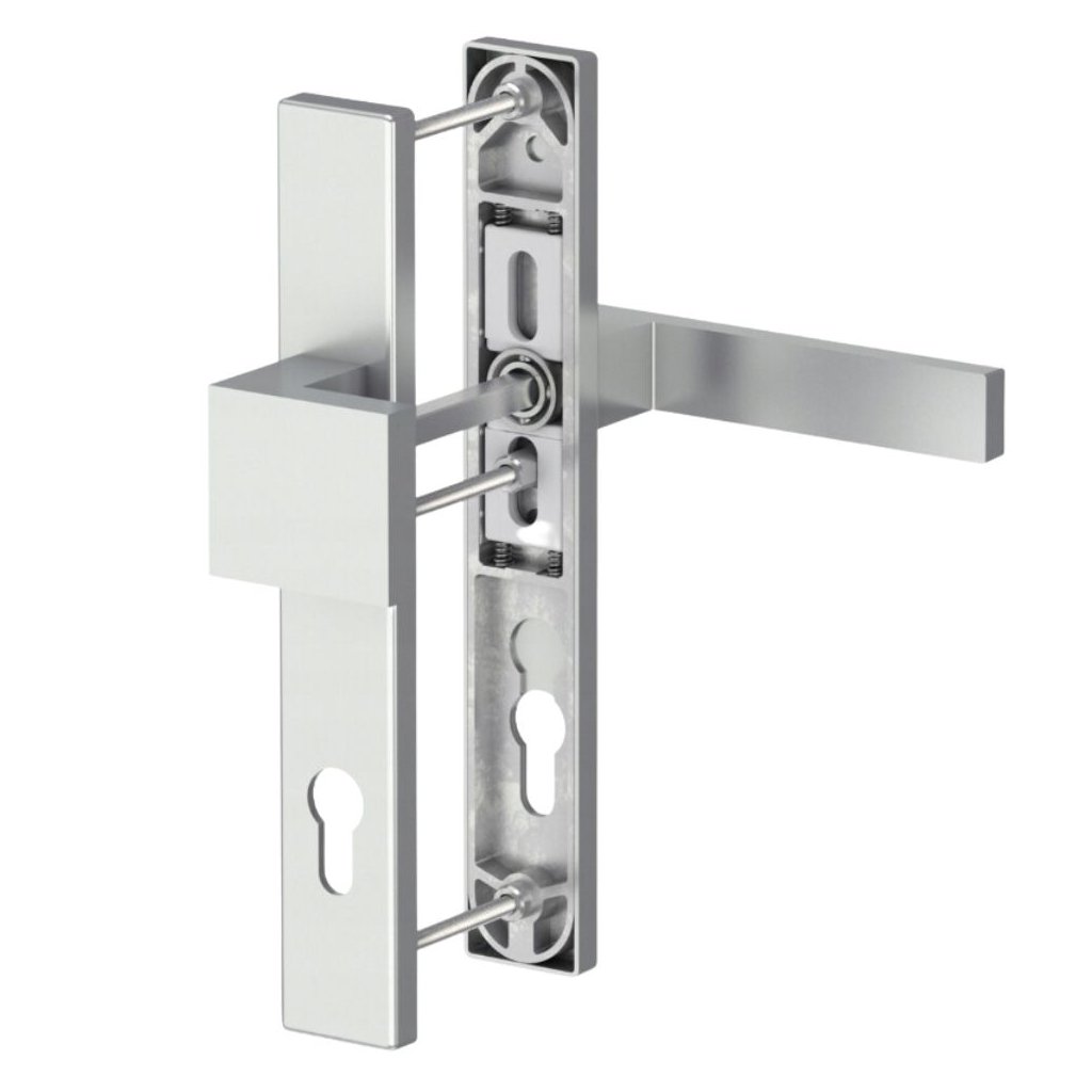 Kovanie na guľový kľúč od tradičného výrobcu kovania Medos v atraktívnom štvorcovom rade Dublin. Vyrobené z extrudovaného hliníka pre vonkajšie dvere so šírkou 71-86 mm. Šírka dosky 37 mm so skrytými skrutkami a rozstup 92 mm bez skrytej vložky. Obojstranná pružina pre presnú polohu kľučky a plynulý pohyb kľučky. Kompletná súprava vrátane štvorcovej hrany 128 mm a upevňovacieho materiálu.