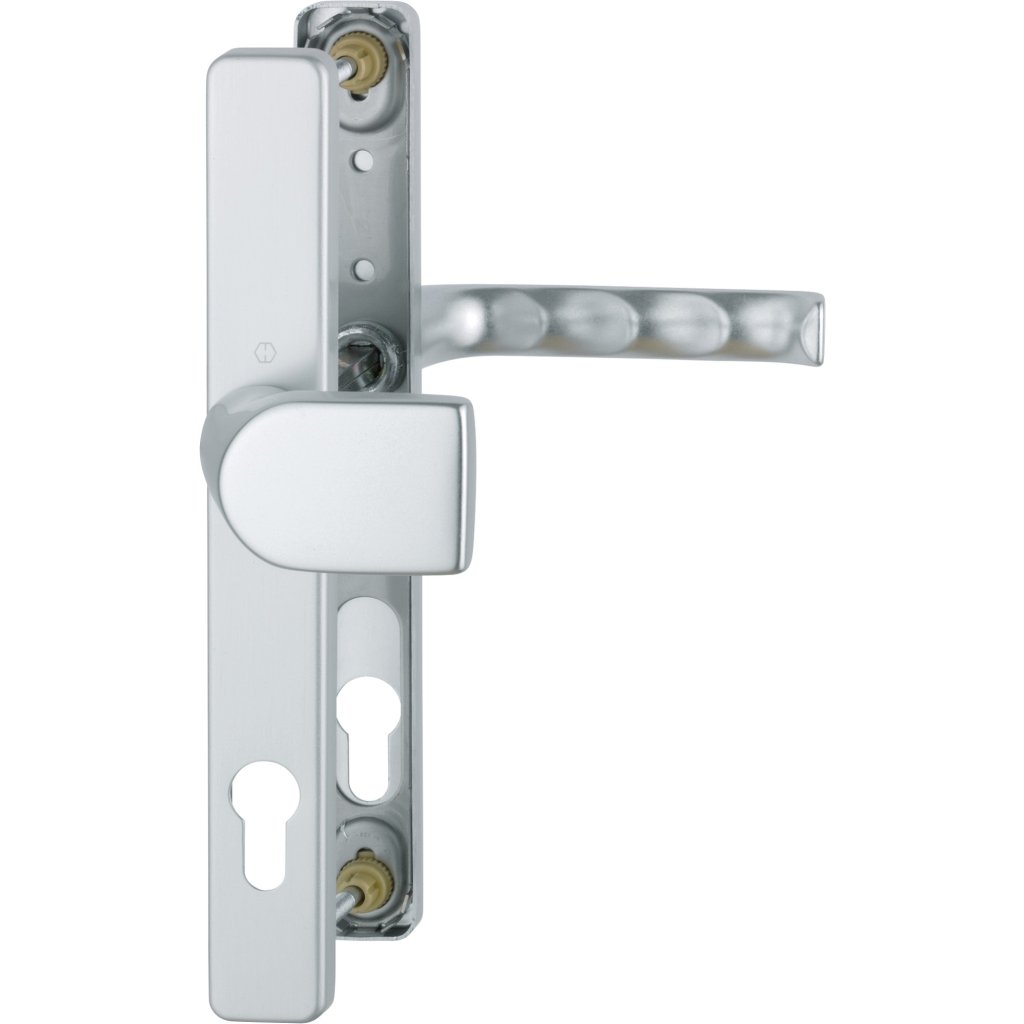 Luxusné kovanie na štítové dvere Hoppe London, guľa/kľúč, úzka platnička, strieborná F1 /8 mm, PZ92/. Pre vchodové dvere s hrúbkou 67-72 mm. Elegantné hliníkové dverové kovanie bez krytu cylindrickej vložky. Vrátane štvorhranu a spojovacích skrutiek pre dvere hrúbky 67-72 .