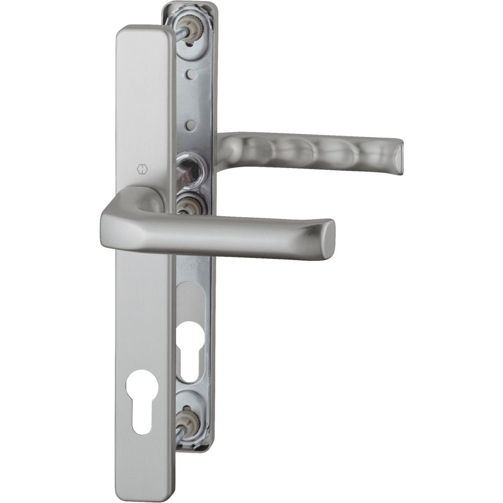 Luxusná štítová kľučka Hoppe London, úzka doska, titán F9 /8 mm,PZ92/. Pre vchodové dvere s hrúbkou 67-72 mm. Elegantné hliníkové dverové kovanie bez krytu cylindrickej vložky. Vrátane štvorhranu a spojovacích skrutiek pre dvere hrúbky 67-72 .