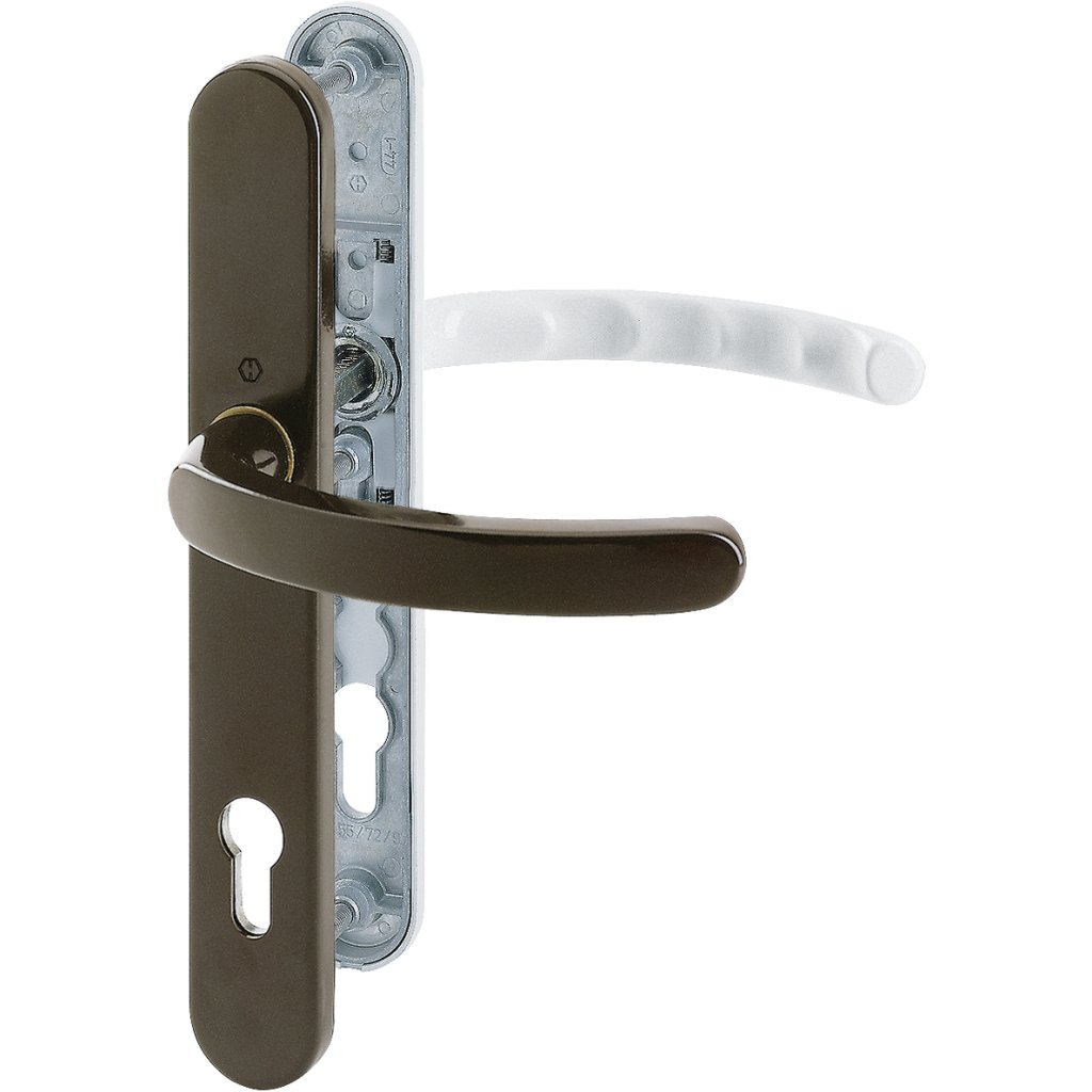Luxusná štítová kľučka/kľučka Hoppe Luxembourg, úzka doska, dve farby, zvonka hnedá F8707 (RAL8077), zvnútra biela RAL9016, rozteč 92 mm. Vrátane štvorhranu a spojovacích skrutiek pre dvere s hrúbkou 62-67 mm.