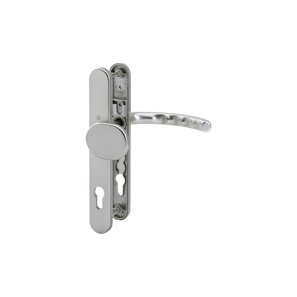 Bezpečnostné kovanie s úzkou doskou s prekrytím pre profilové dvere. Skrutkovateľné tromi skrutkami, pevná/otočná kľučka s obojstranným jazýčkom.