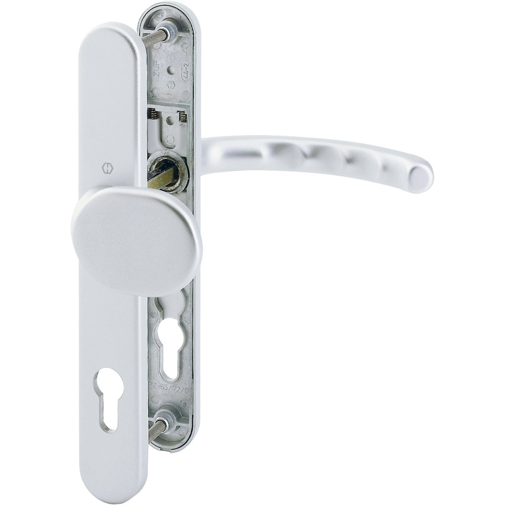 Luxusné kovanie na štítové dvere guľa/kľučka Hoppe Luxembourg, úzka doska, F1-2 mat/8 mm,PZ92/. Pre vchodové dvere s hrúbkou 72-77 mm. Elegantné hliníkové dverové kovanie bez krytu cylindrickej vložky. Vrátane štvorhranu a spojovacích skrutiek pre dvere hrúbky 72-77.