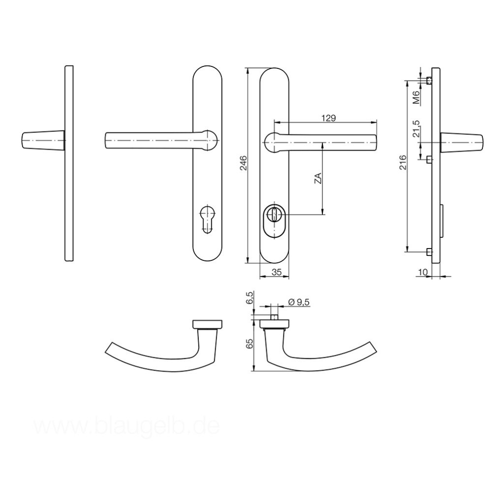 Kovanie Blaugelb s kľučkami DGT35 PZ92 ZA so šírkou štítu 35 mm (rozstup PZ92) a ochranou proti privretiu je vhodné pre drevené, plastové a kovové vonkajšie dvere. Je vybavené upínacím mechanizmom na presné umiestnenie kľučky. Okrem toho napínacia pružina podporuje pružinu poistnej matice pri spätnom zábere kľučky. Vnútorný štít kovania blaugelb s kľučkami DGT35 PZ92 ZA sa dá vďaka technológii guľôčkového klipu jednoducho vybrať a namontovať. Kovanie sa upevňuje skrytým skrutkovaním.