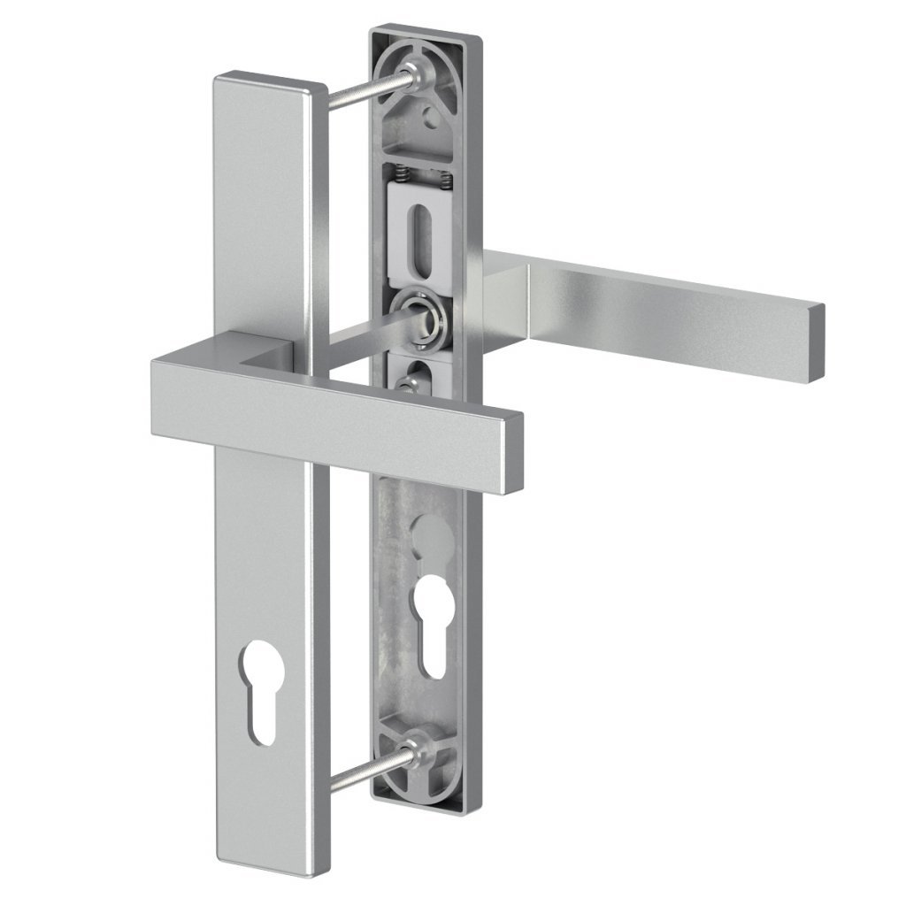 Kovanie na kľučky dverí od tradičného výrobcu kovania Medos v atraktívnom štvorcovom dizajne radu Dublin. Vyrobené z extrudovaného hliníka pre vonkajšie dvere so šírkou 71-86 mm. Šírka dosky 37 mm so skrytými skrutkami a rozstup 92 mm bez skrytej vložky. Obojstranná pružina pre presnú polohu kľučky a plynulý pohyb kľučky. Kompletná súprava vrátane štvorcovej hrany 128 mm a upevňovacieho materiálu.