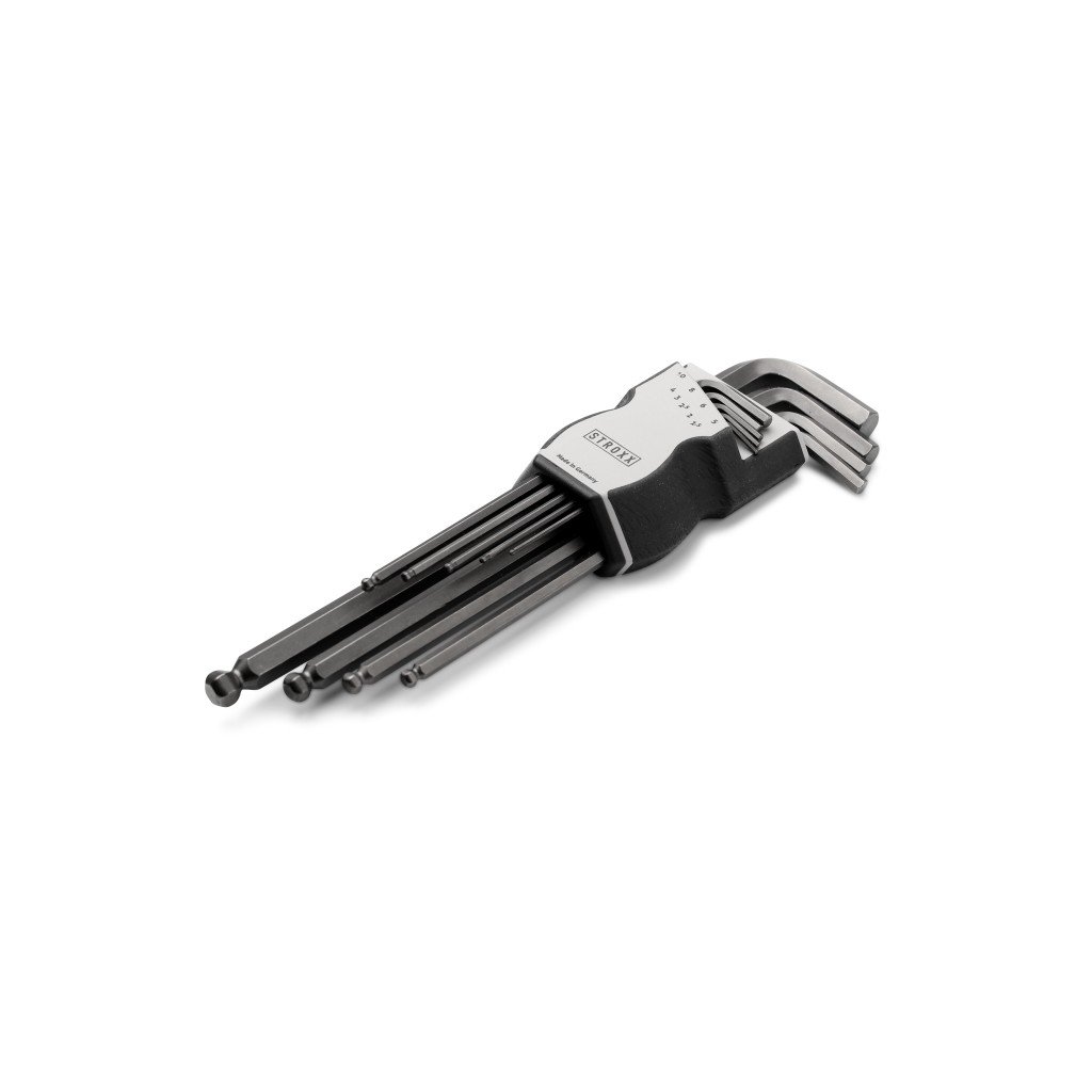 Sada imbusových kľúčov Stroxx je vyrobená z vysokokvalitnej chróm-vanádiovej ocele s matným chrómovým povlakom pre maximálnu odolnosť proti korózii a dlhú životnosť. Guľové hlavy na oboch koncoch kľúčov umožňujú jednoduché použitie aj v náročných montážnych situáciách a skrutkovanie pod uhlom až 25°. Súprava obsahuje deväť kľúčov vo veľkostiach od 1,5 do 10 mm.