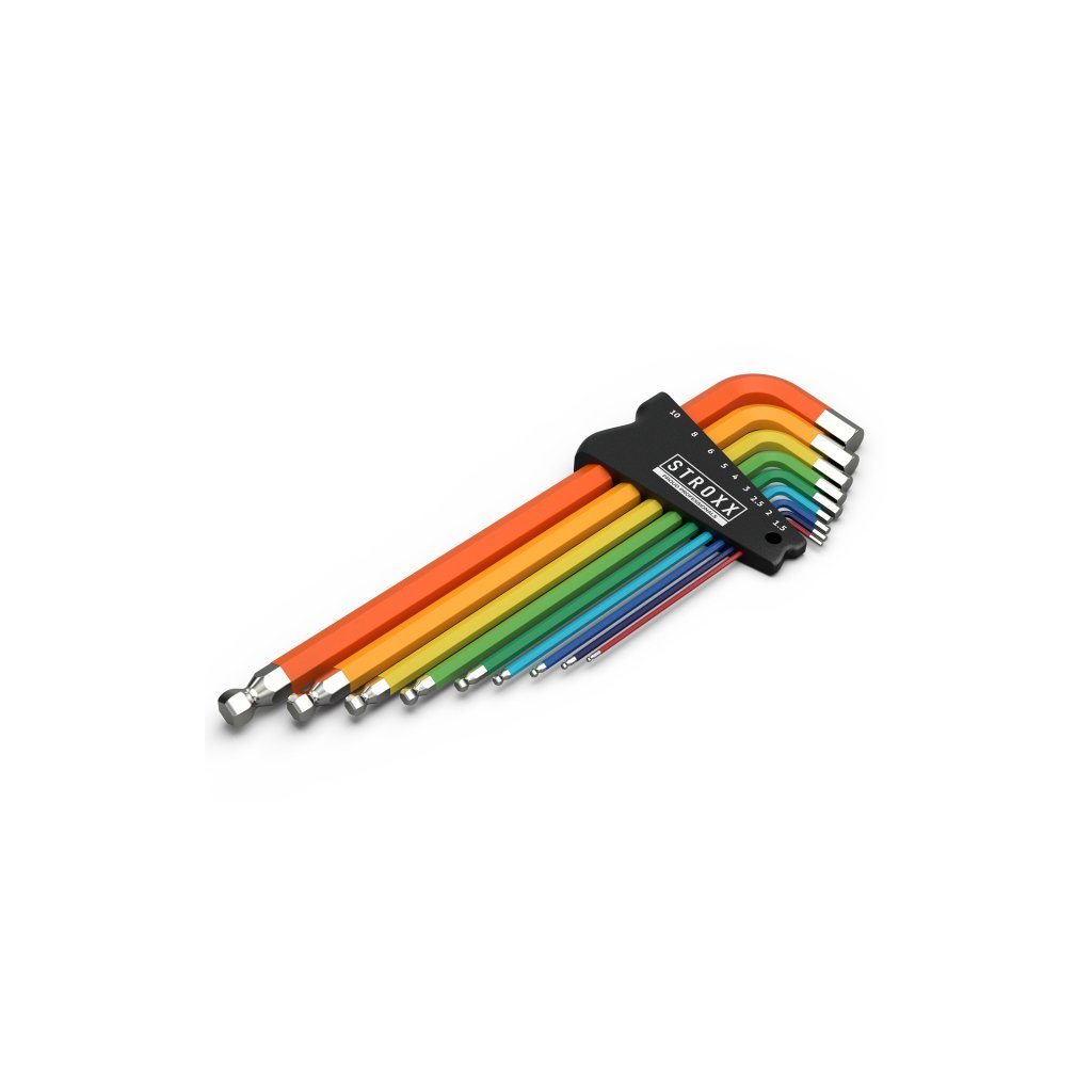 9 kusov dlhých imbusových kľúčov s guľovou hlavou, praktické farebné rozlíšenie. V plastovom držiaku.