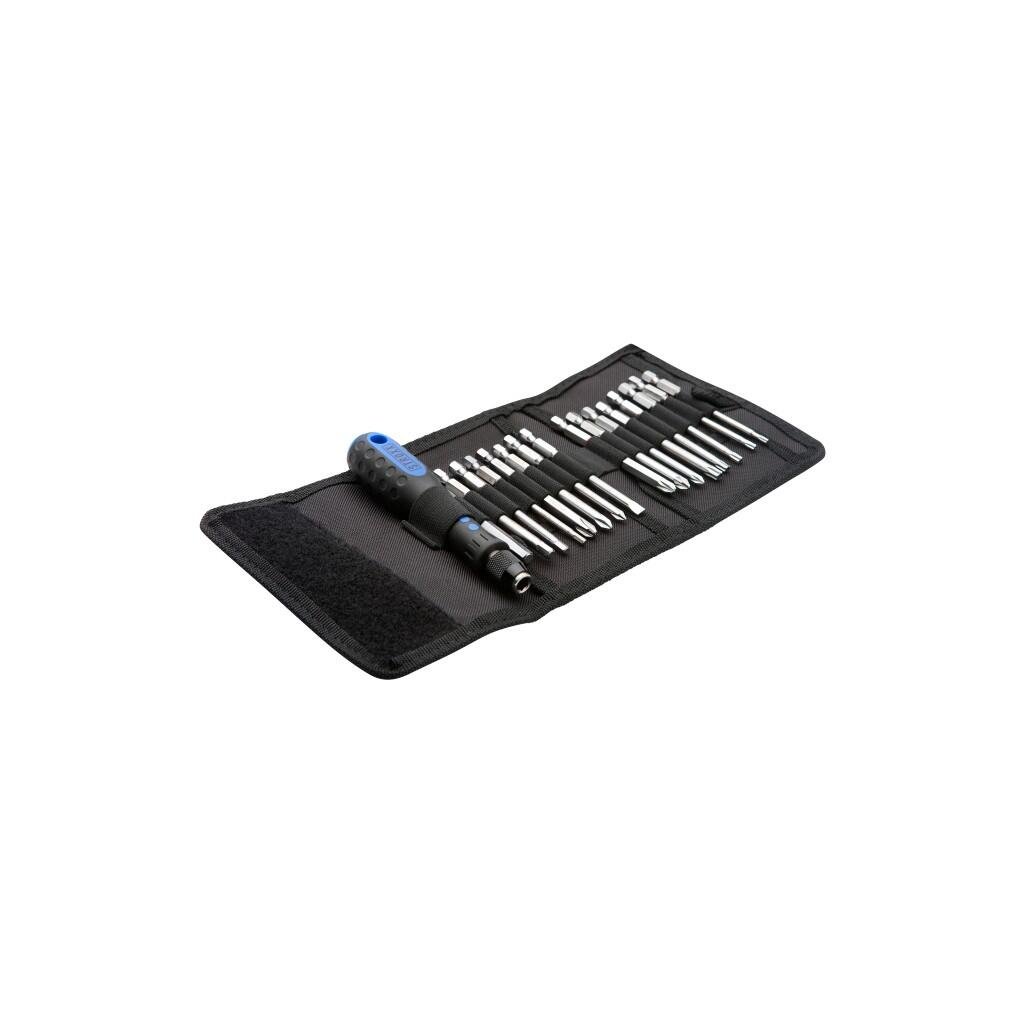 - Sada bitových skrutkovačov 17-dielna, uložená v praktickom puzdre na suchý zips. Balenie obsahuje Torx TX, Pozidriv PZ, Flat SL, Phillips PH, Inbus H. Rýchloupínací krúžok na rýchlu výmenu.