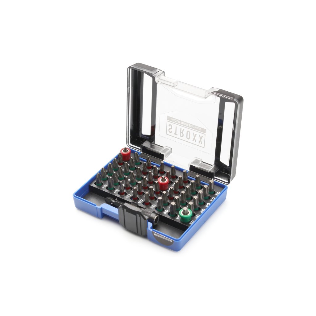 Profesionálna sada bitov STROXX obsahuje celkom 49 dielov a je určená na použitie s vŕtačkami a skrutkovačmi. Farebne označené rukoväte jednotlivých bitov umožňujú ich ľahkú identifikáciu pri výbere.