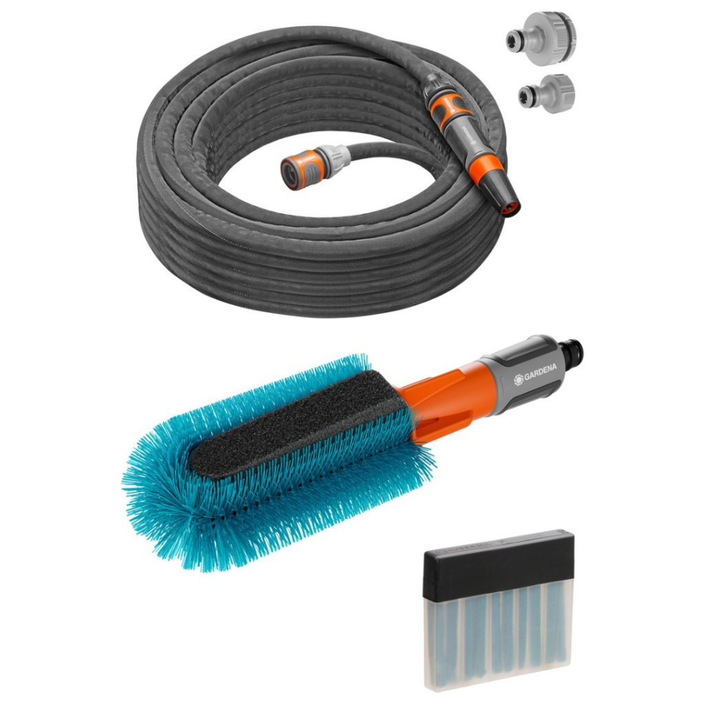 Súprava je vybavená všetkým, čo potrebujete na účinné čistenie kolies. Okrem kefy na bicykle od spoločnosti GARDENA obsahuje súprava 15 m dlhú hadicu GARDENA Liano™ Life 1/2" vrátane prípojok na kohútik, hadicových spojok a postrekovača na čistenie. Okrem toho GARDENA čistiace tyčinky pre žiarivé výsledky. Mydlové tyčinky sú vhodné na tvrdé a citlivé povrchy a jednoducho sa vkladajú do prípojky ručnej kefy. Čistiaca tyčinka sa potom obklopí vodou a rovnomerne sa rozotrie po čistenom povrchu.