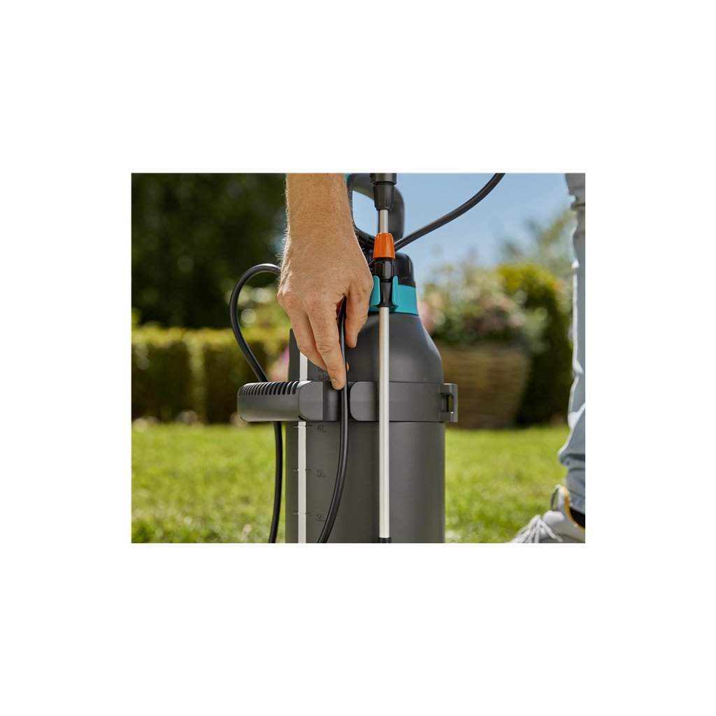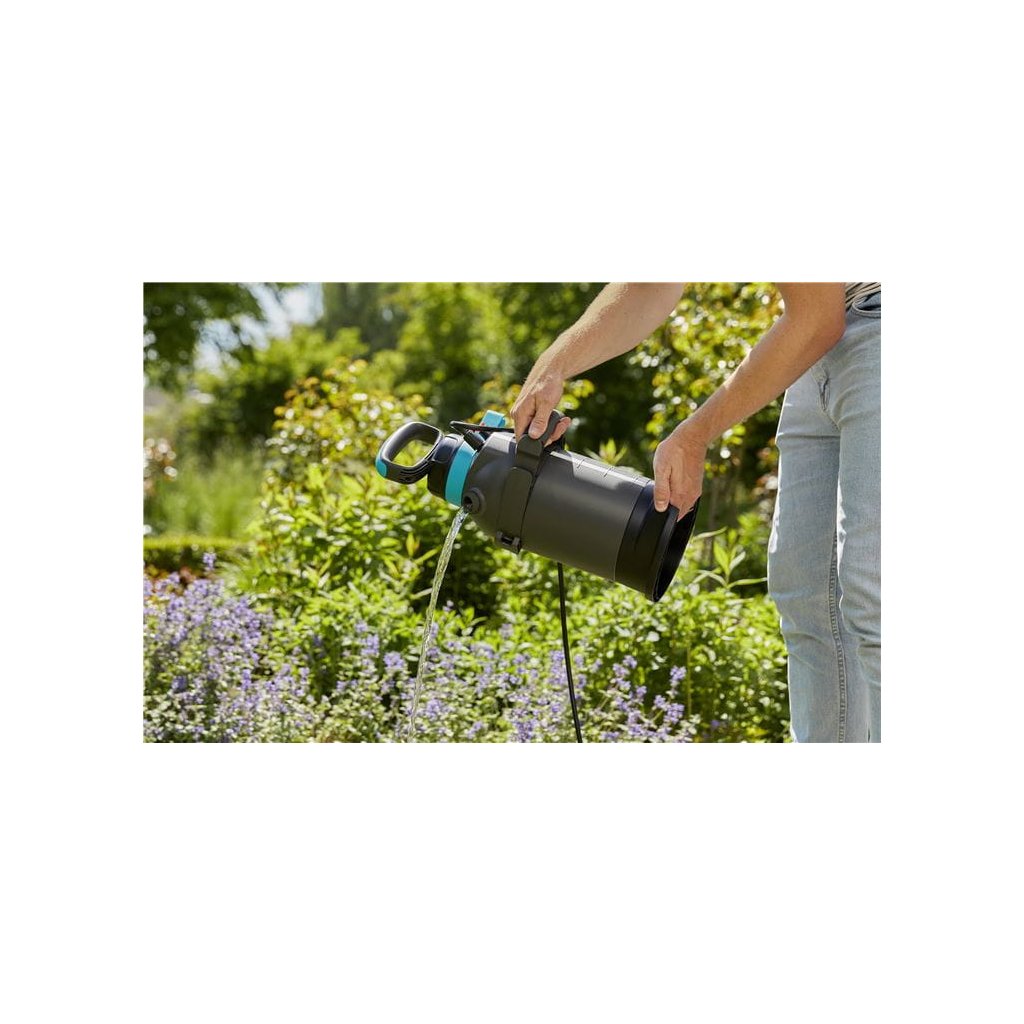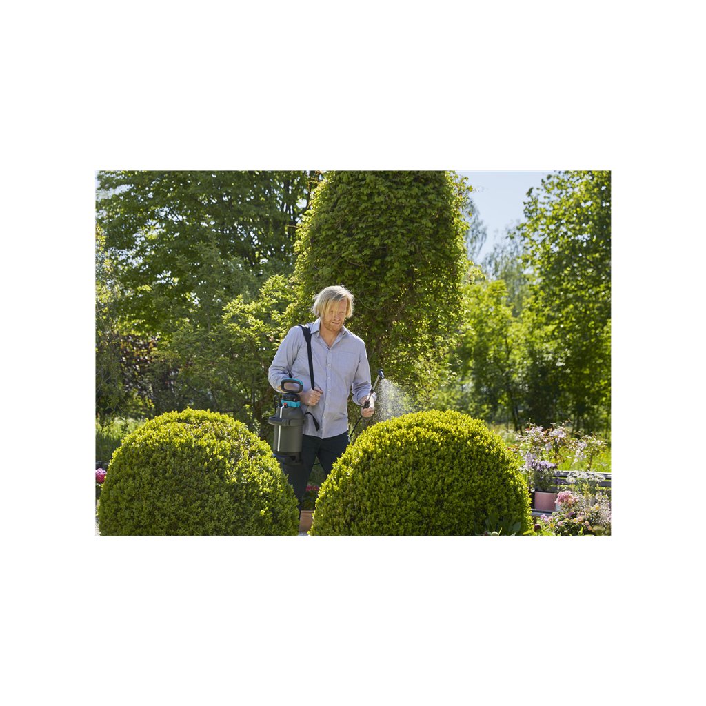 Tlakový postrekovač GARDENA EasyPump 5 l je ideálny na postrekovanie rastlín a kríkov. Je napájaný integrovaným lítium-iónovým akumulátorom, ktorý umožňuje postrekovanie bez čerpania, pretože v nádobe sa neustále vytvára konštantný tlak. Na jednoduché plnenie, meranie a vyprázdňovanie 5-litrovej nádoby sa na nádobe nachádza druhý otvor s integrovanou odmerkou. Postrekovač napájaný batériou vám ponúka vysokú úroveň ergonómie. K dispozícii je napríklad druhá rukoväť, ktorá uľahčuje používanie, a hadicu môžete po použití omotať okolo nej, aby ste ušetrili miesto. Ďalší komfort pri používaní zabezpečujú polstrované popruhy na prenášanie, teleskopická tyč, šikmá striekacia tryska, prídavná plochá striekacia tryska a ergonomická rukoväť čerpadla a tyče. Vďaka priehľadnej lište vždy vidíte aktuálny stav naplnenia. Pri aplikácii pesticídov alebo zalievaní rastlín máte k dispozícii tieto možnosti: rozprašovací prúd, jemná hmla a plochý prúd na presnú aplikáciu v úzkych miestach. Môžete pracovať aj dlhší čas: batéria tlakového postrekovača môže pracovať na plný výkon až 2 hodiny. Tlakový postrekovač EasyPump s objemom 5 l sa dodáva so zaujímavými receptami na výrobu vlastných ekologických roztokov. Súčasťou balenia je aj nylonový filter na filtrovanie domácich roztokov na starostlivosť o rastliny.