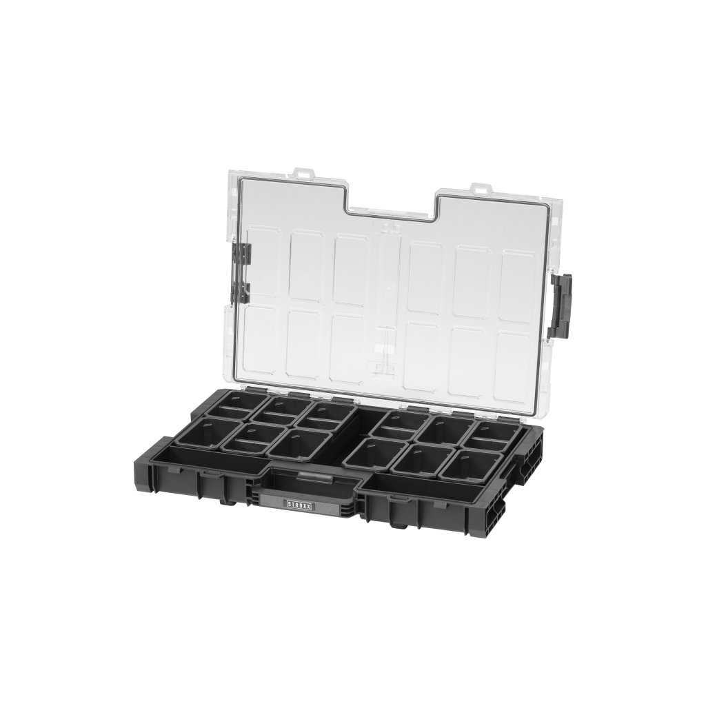 Úložný box STROXX veľkosti L s priehľadným vekom je profesionálne riešenie na bezpečné a prehľadné uloženie malých dielov, ako sú skrutky, hmoždinky, bity alebo elektroinštalačný materiál. Box je vybavený 12 multifunkčnými, vyberateľnými priehradkami, ktorých usporiadanie sa dá vďaka modulárnej nastaviteľnosti ľahko prispôsobiť.