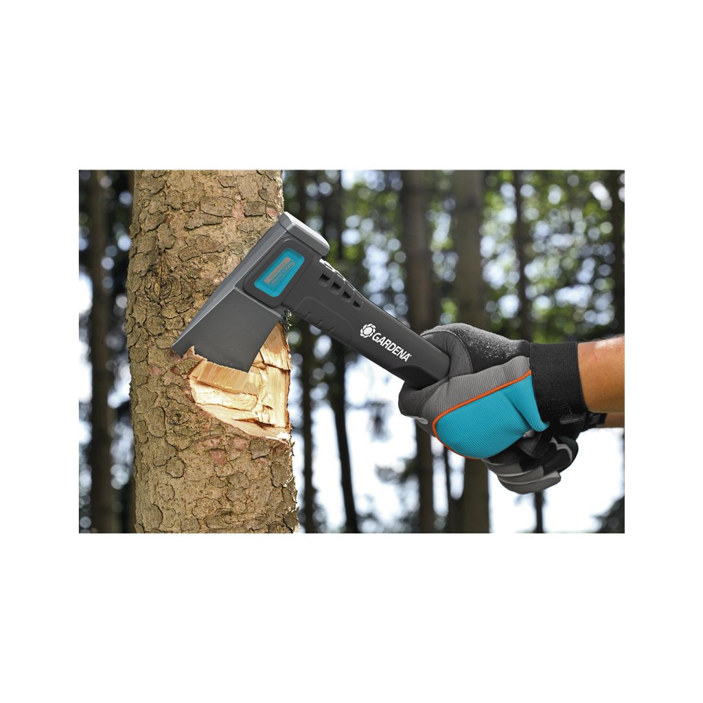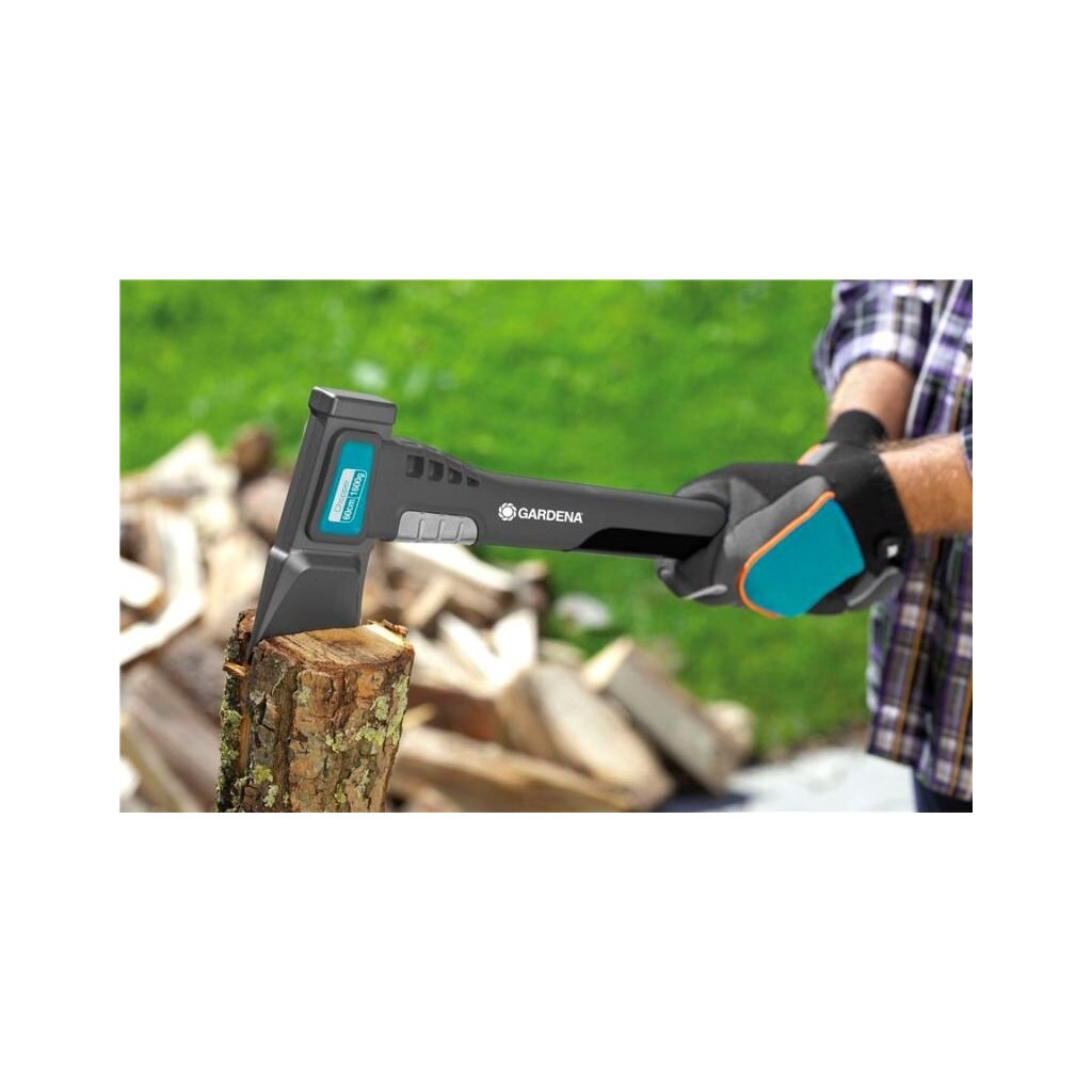 Malá univerzálna sekera, ideálna na sekanie čerstvého dreva alebo štiepanie dreva obsahujúceho živicu. Univerzálna sekera 1000A od spoločnosti GARDENA je určená na rôzne druhy prác s malým drevom. Hlava sekery má nepriľnavý povrch, ktorý znižuje trenie a uľahčuje prenikanie do dreva; geometria hlavy je prispôsobená na prácu s drevom. Násada vystužená PA vláknami je odolná a pevná. Ťažisko v blízkosti hlavy sekery zabezpečuje dokonalé vyváženie a rozloženie hmotnosti. Táto kombinácia umožňuje ľahké prenikanie do dreva a účinné štiepanie. Funkcia kladiva na jednoduché a účinné použitie štiepacích klinov (oceľové kliny sa nesmú používať).