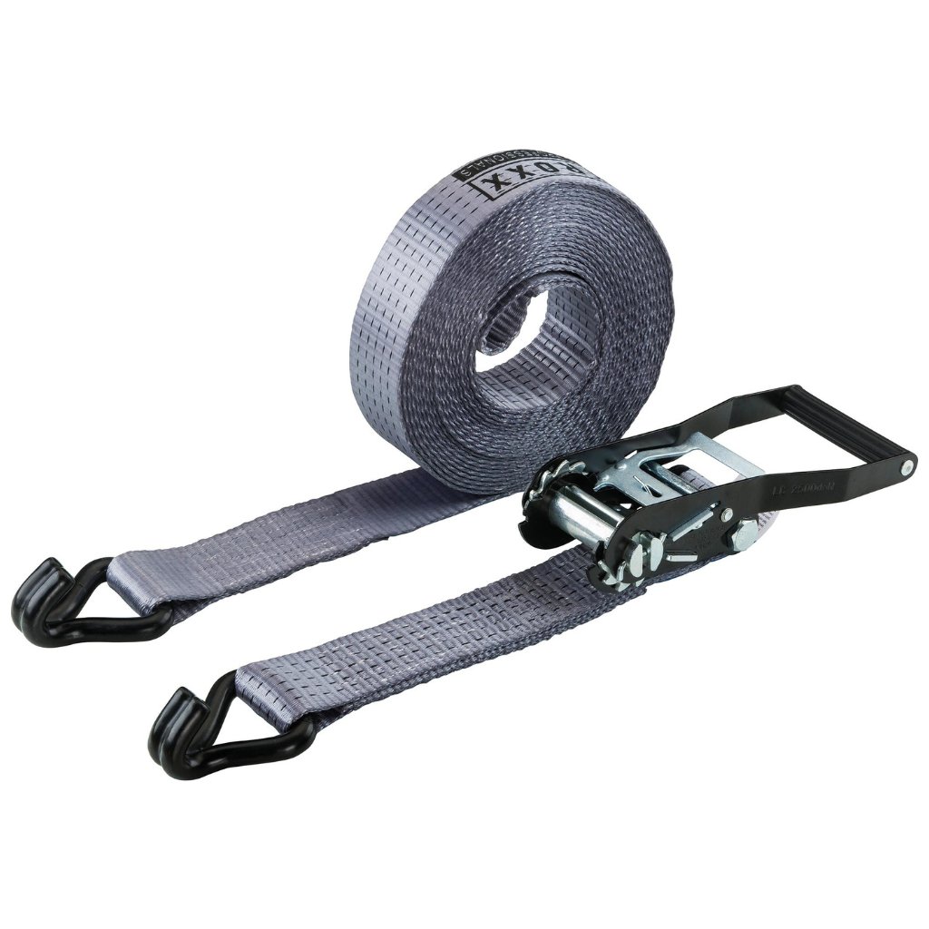 Upínacie popruhy s račňou a U-hákmi, 50 mm × 10 m, nosnosť 5000 kg, sivé (2-dielne)