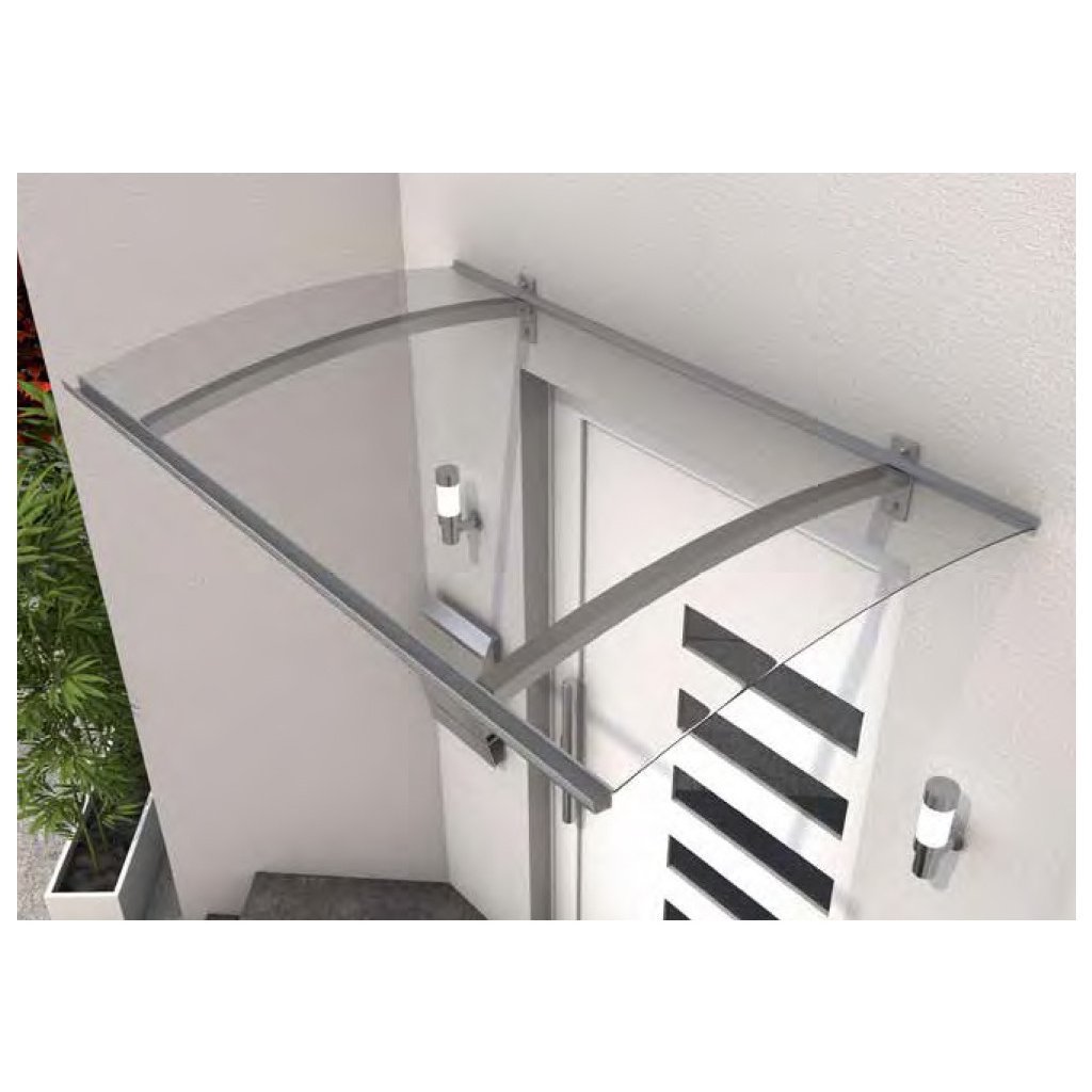 Strieška je vyrobená z 3 mm silného akrylátového skla, ktoré je priehľadné, UV stabilné a odolné voči poveternostným podmienkám. Nosná konštrukcia je tvorená práškovane lakovaným hliníkom s efektom nerezovej ocele, čo zaručuje dlhú životnosť, ľahkú údržbu a moderný vzhľad. Súčasťou je aj integrovaný odkvapový žľab, ktorý efektívne odvádza dažďovú vodu.