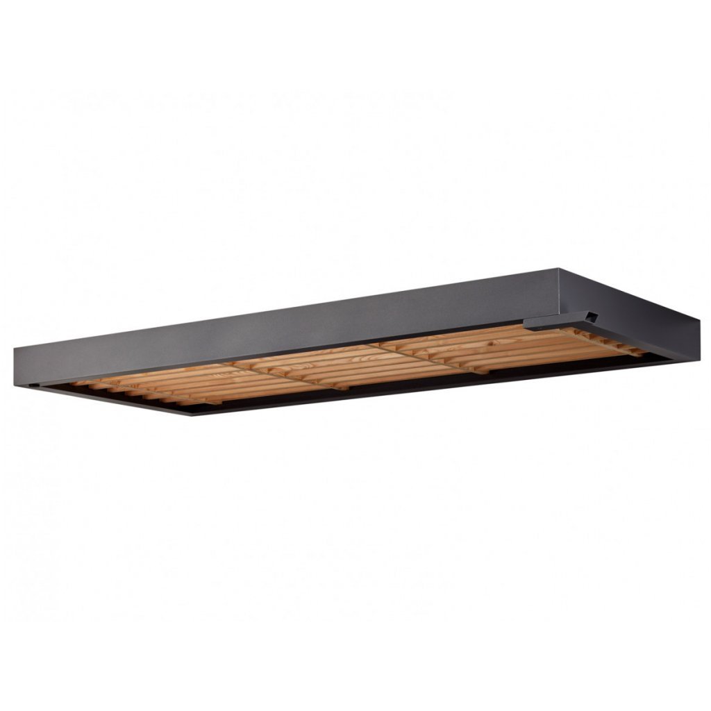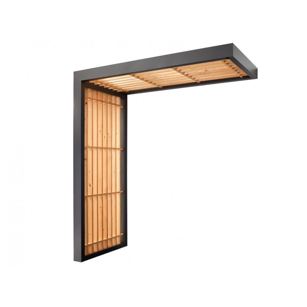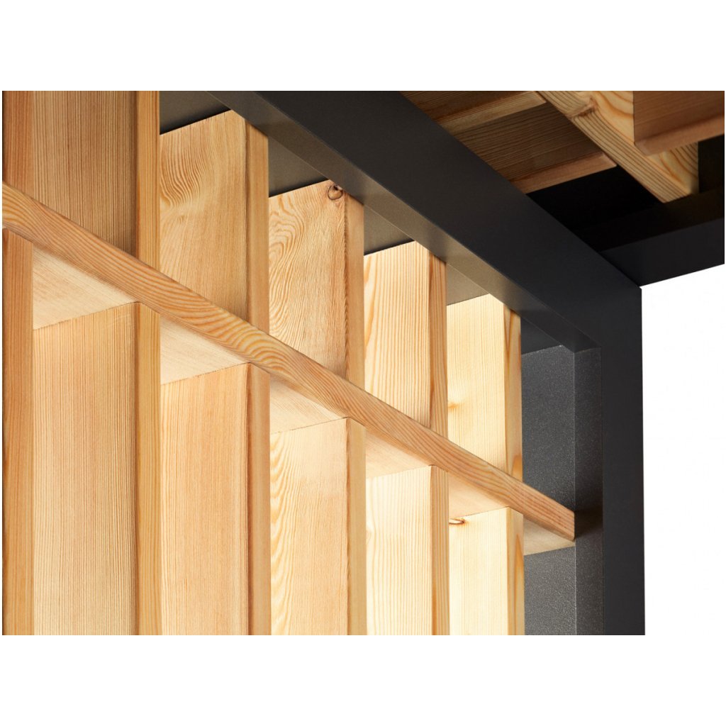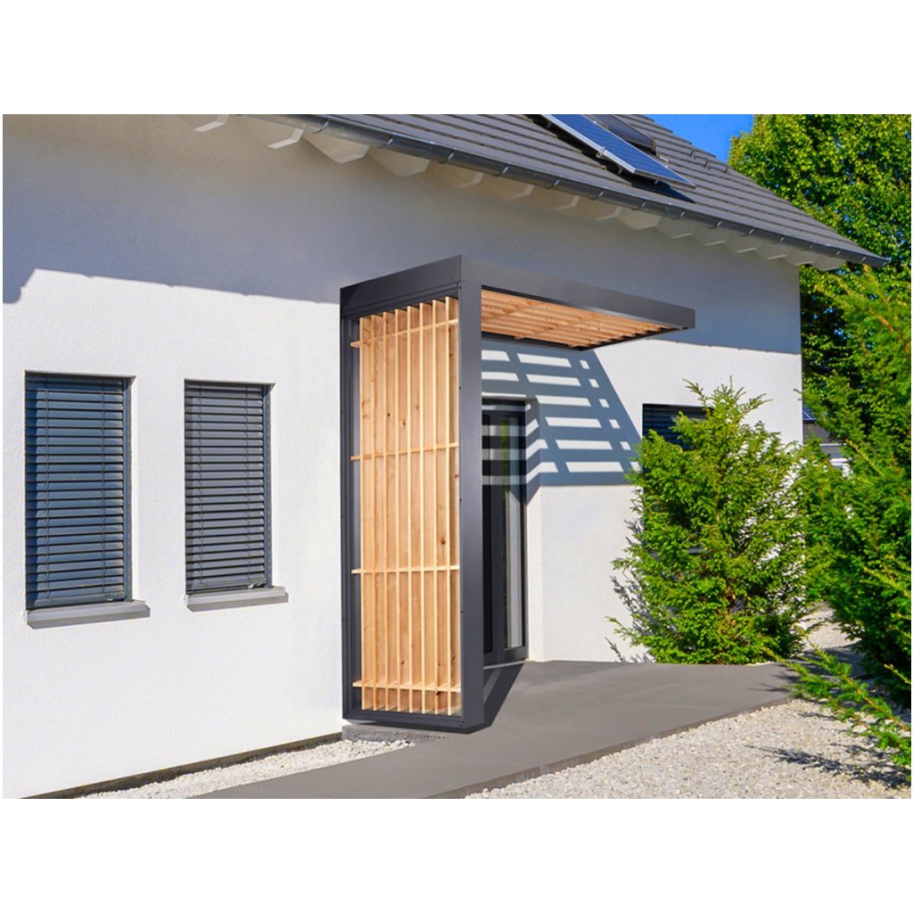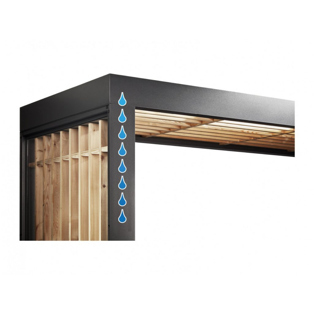Hliníková konštrukcia je ošetrená jemnou štruktúrovanou práškovou farbou v elegantnom odtieni antracitu, ktorá je vysoko odolná voči poškriabaniu, korózii a poveternostným podmienkam. Drevo Schwarzwaldskej jedle dodáva strieške prirodzený a teplý vzhľad a zároveň je veľmi odolné voči poveternostným vplyvom.