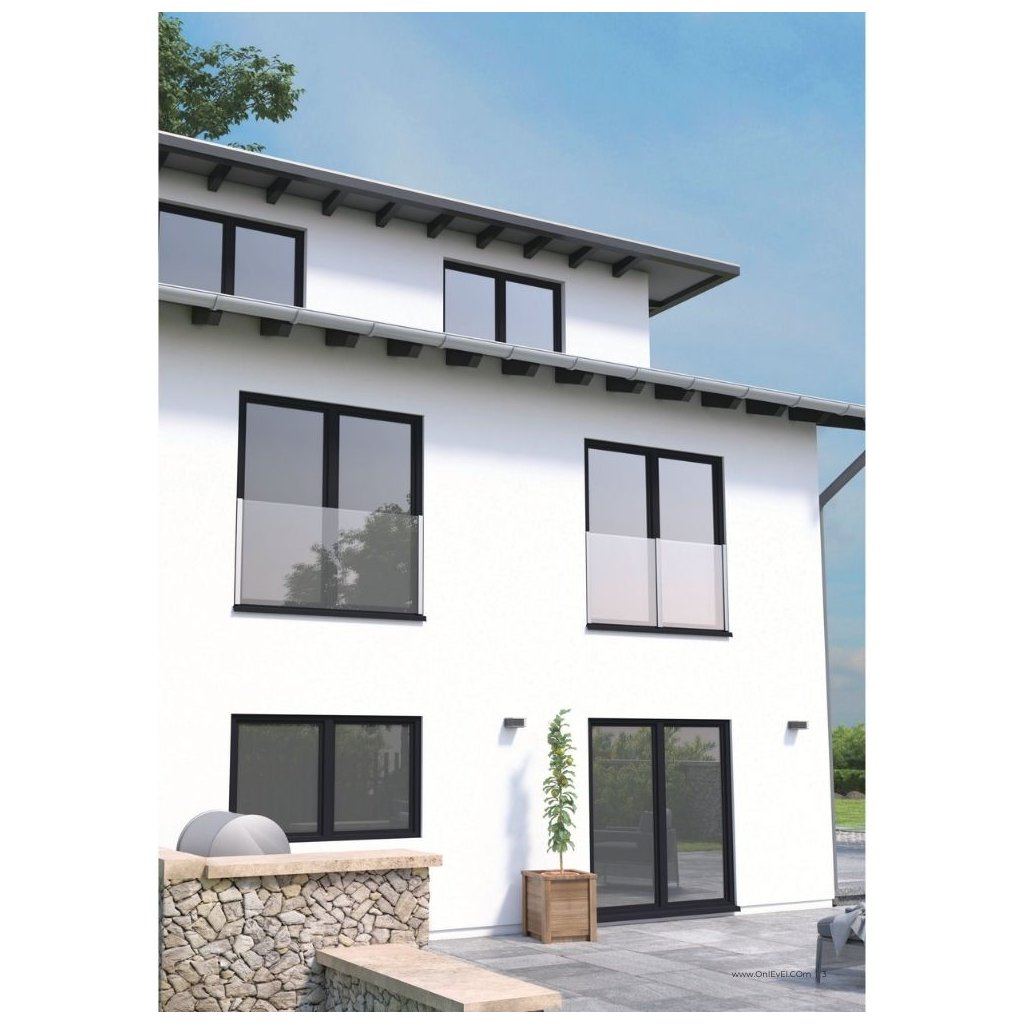 Inovatívny trendový systém skleneného zábradlia SKYFORCE pred francúzske okná v atraktívnej matnej antracitovej farbe. Cenovo veľmi efektívny systém zábradlia francúzskych okien.