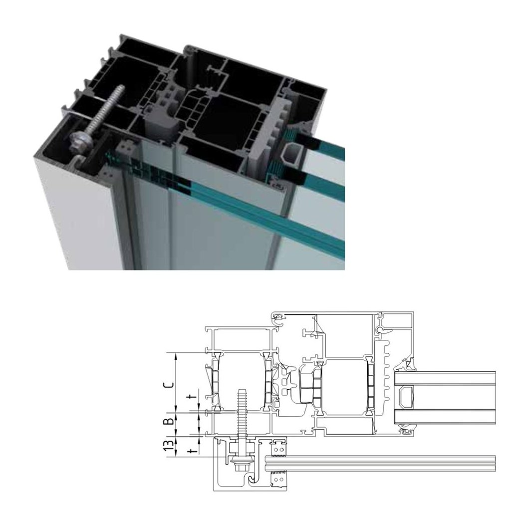 - Opatrne (ideálne pomocou prísaviek na sklo) priložte sklo k nosnému profilu a zaistite ho krycím profilom.
