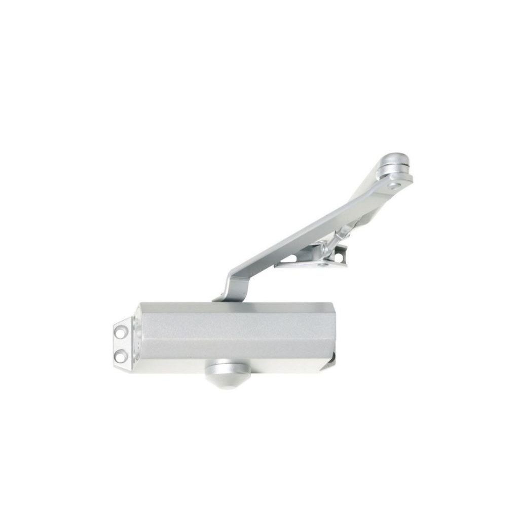 Zatvárač dverí TS 10 D s rukoväťou, strieborný, podľa EN 2/3/4. Pre maximálnu šírku krídla 1100 mm, nastavenie koncového dorazu, nastavenie rýchlosti zatvárania.Dodatočné parametre